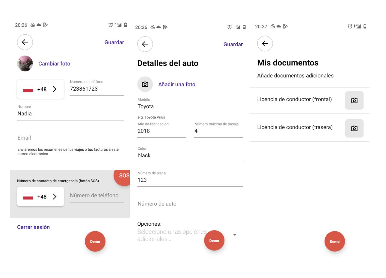 Detalles del coche (color, año, modelo, número de placas, máximo de pasajeros).