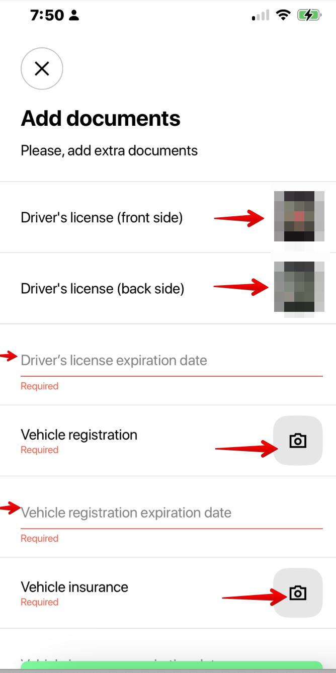 Se aceptan los siguientes formatos para los documentos del conductor: ".png", ".jpg", ".jpeg". El tamaño máximo permitido para cada archivo del conductor es de 5 mb. En caso de que haya un error al agregar un documento, lo más probable es que el tamaño sea demasiado grande y deba ajustarse.