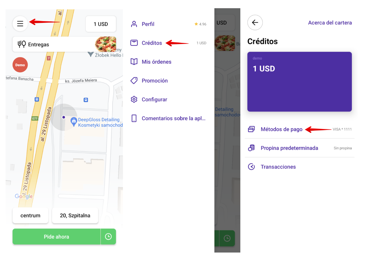 Cada última tarjeta de crédito agregada se establece como "Predeterminada". Esto significa que se cobrará al final del viaje por los servicios que operan con el método de pago con tarjeta de crédito.