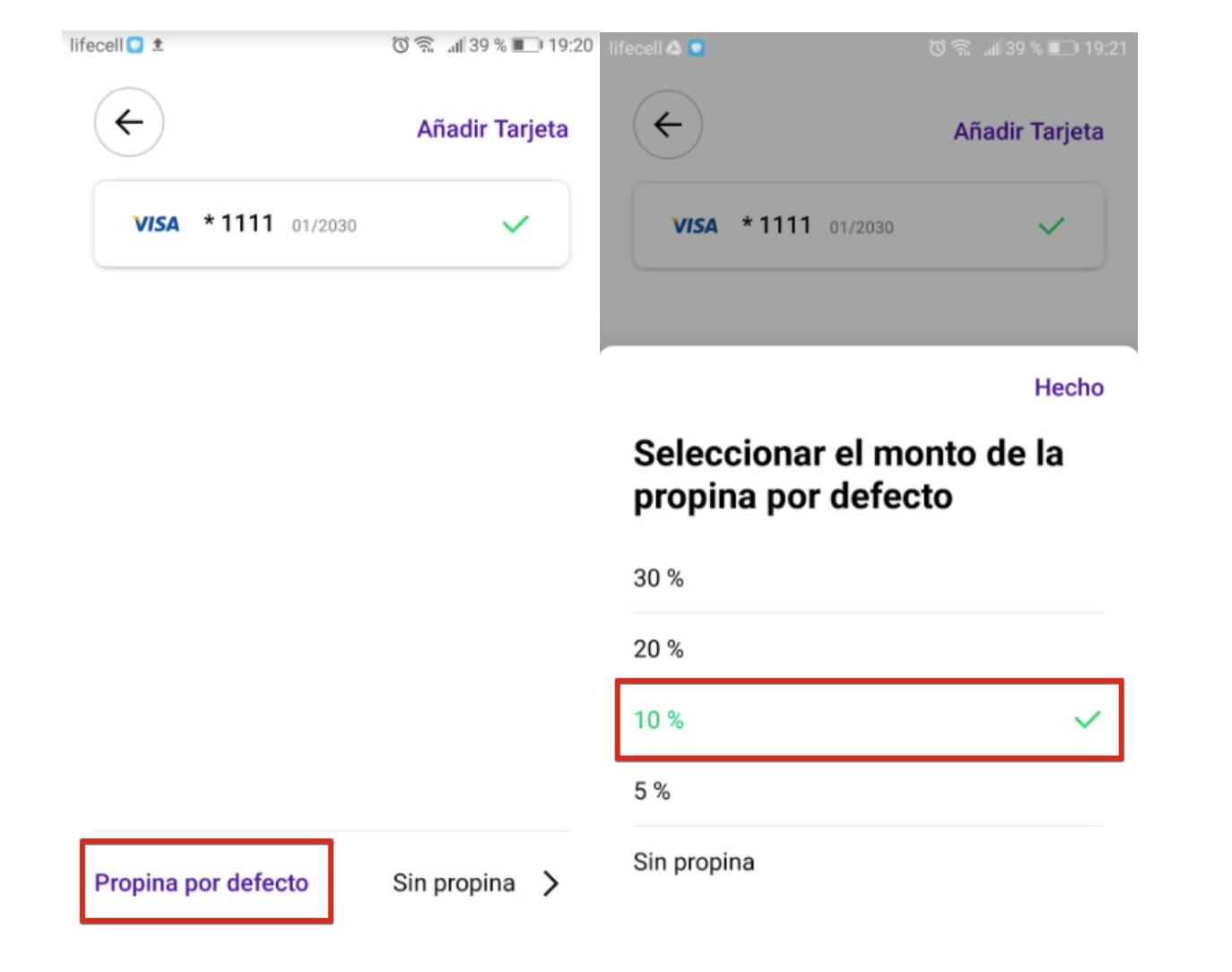 En la pestaña "Métodos de pago" también puedes especificar el porcentaje de "propina" predeterminado que se aplicará para los viajes en el método de pago con tarjeta de crédito. Simplemente selecciona el % que necesitas y se agregará automáticamente a todos tus viajes. El valor de sugerencia predeterminado se puede ajustar en cualquier momento.