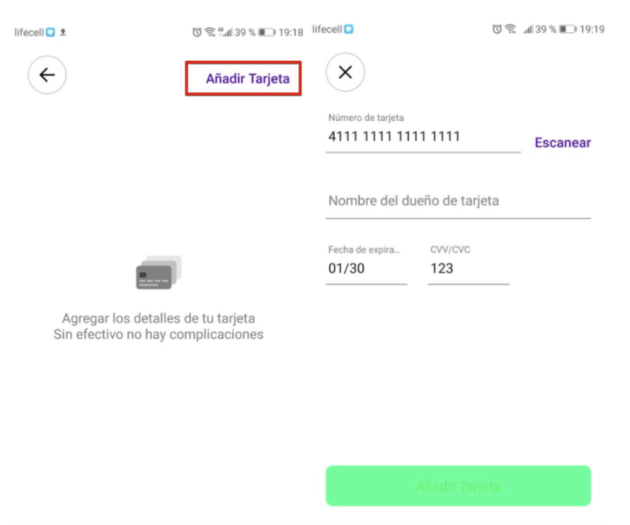 Toca "Agregar tarjeta" y especifica las credenciales válidas de la tarjeta. Finaliza seleccionando "Agregar tarjeta" en la parte inferior de la pantalla y, tras la validación, se agregará la tarjeta.