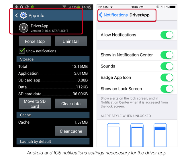 Para Android: Ajustes - Más - Aplicaciones - Aplicación del conductor - “marque” Mostrar notificaciones de esta aplicación.