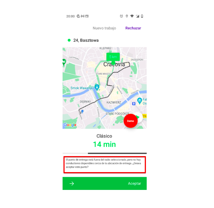 Si la recogida está fuera del radio de trabajo de un conductor, se le notificará en la nueva pantalla de oferta.