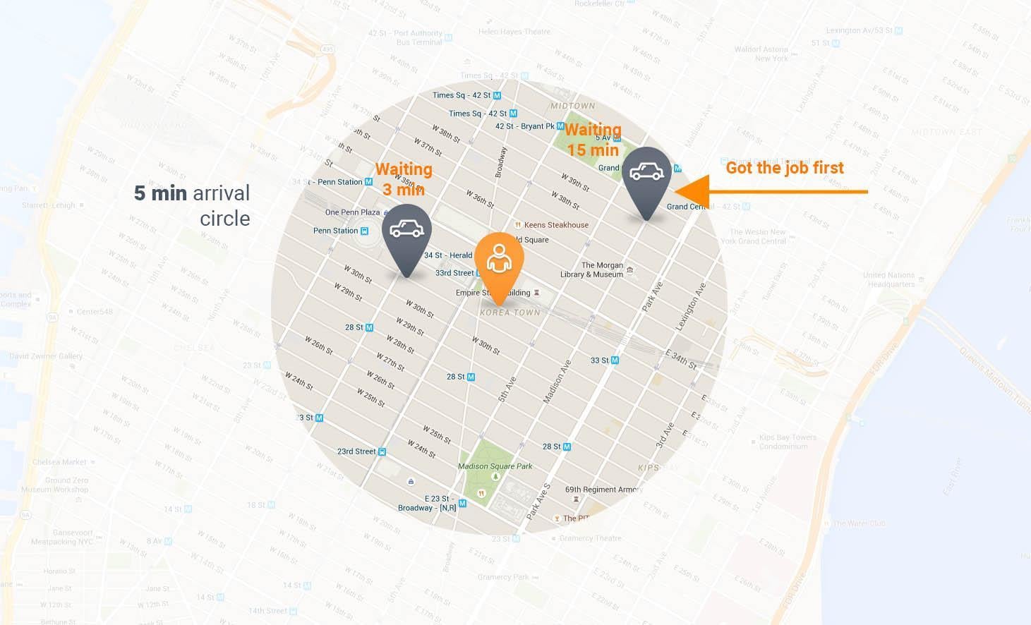 En este ejemplo, la orden está dentro del radio de trabajo de ambos conductores. Los conductores están a menos de 5 minutos del cliente, tienen aproximadamente el mismo reputación, pero el tiempo de espera es diferente. El primer conductor completó un trabajo hace 3 minutos, el segundo conductor terminó su última orden hace 15 minutos.