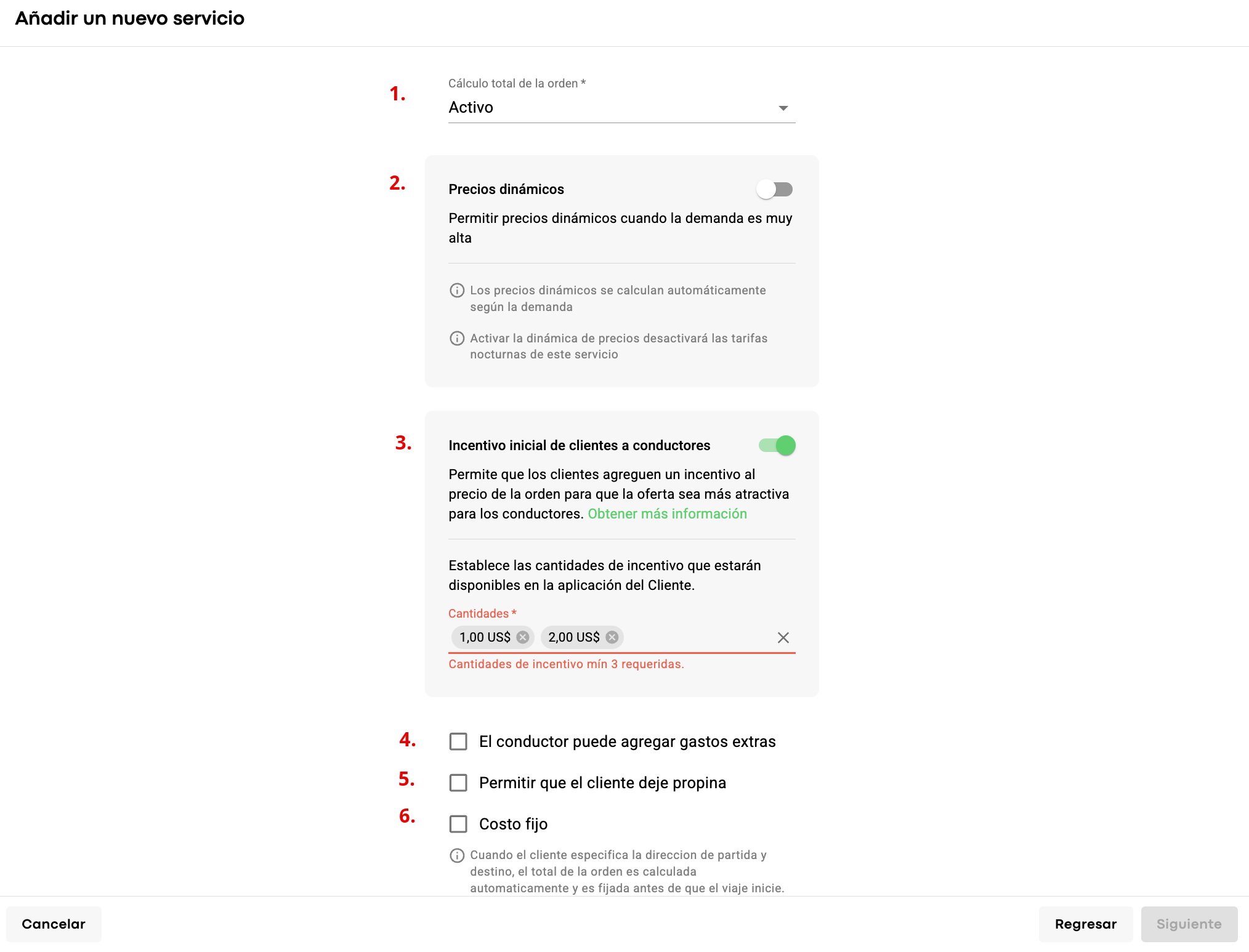 3. Habilita la opción "Bonus inicial de clientes a conductores" para que la oferta sea más atractiva para los conductores y especifica los montos de bonus que estarán disponibles en la aplicación del Cliente. Se pueden configurar un mínimo de 3 y un máximo de 5 bonus.