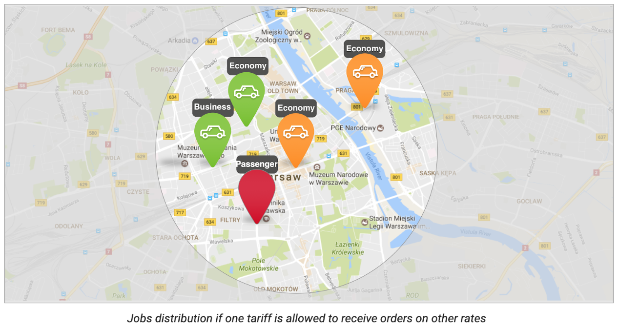 Permitamos que la tarifa corporativa reciba viajes con la tarifa económica. Cuando un cliente solicite un taxi económico, el sistema verifica si hay taxis adecuados en la zona. Como podemos ver en la imagen, hay 2 coches disponibles: Uno económico y otro corporativo. El sistema formará una cola de estos conductores dependiendo de su karma, tiempo de espera y ETA (por favor consulta nuestra publicación sobre el algoritmo de fila inteligente para más detalles). La orden se enviará al primer conductor en la fila. Si este conductor ignora/rechaza la orden, se ofrecerá al siguiente conductor en la cola.