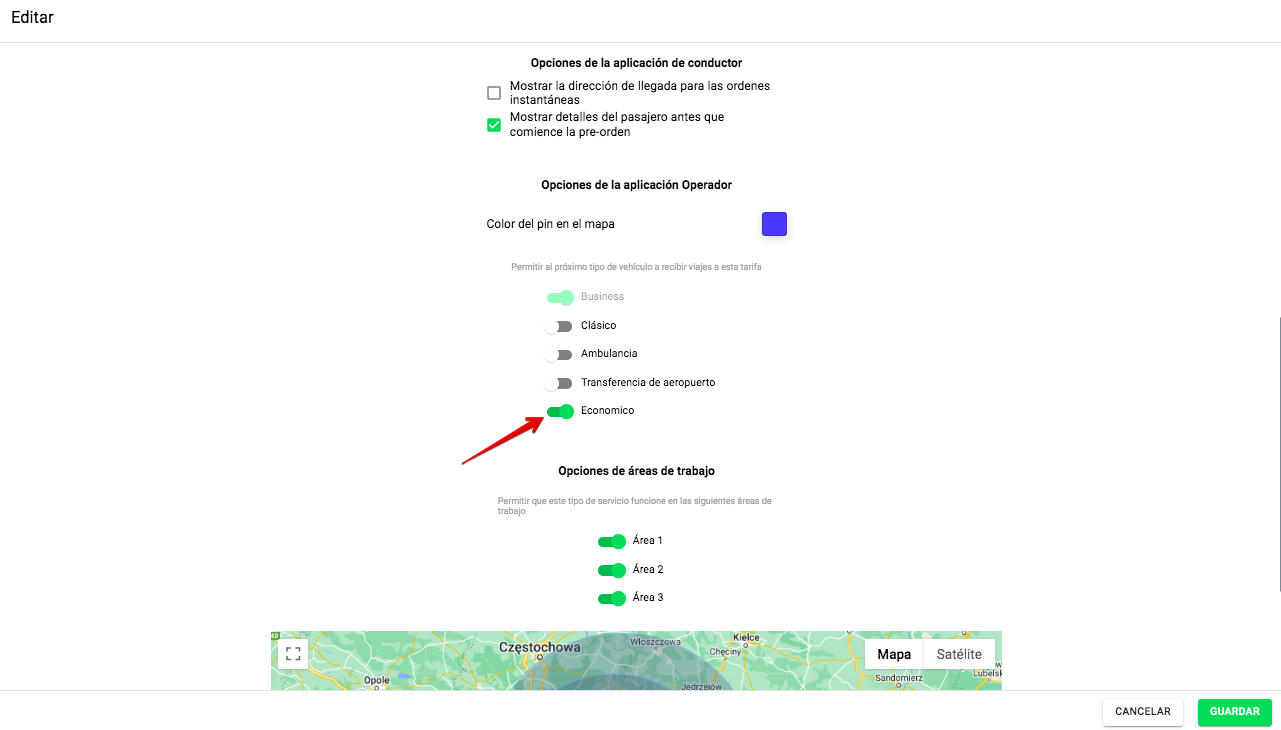 El cliente siempre paga por el servicio solicitado, no por el que finalmente recibió. Una vez que un conductor de Negocios acepta el pedido, el sistema lo presentará al cliente como un conductor Económico. El cliente pagará este viaje de acuerdo con las tarifas económicas. No aconsejamos habilitar la opción "Permitir al próximo tipo de vehículo recibir viajes a esta tarifa" para los servicios de nivel superior.
