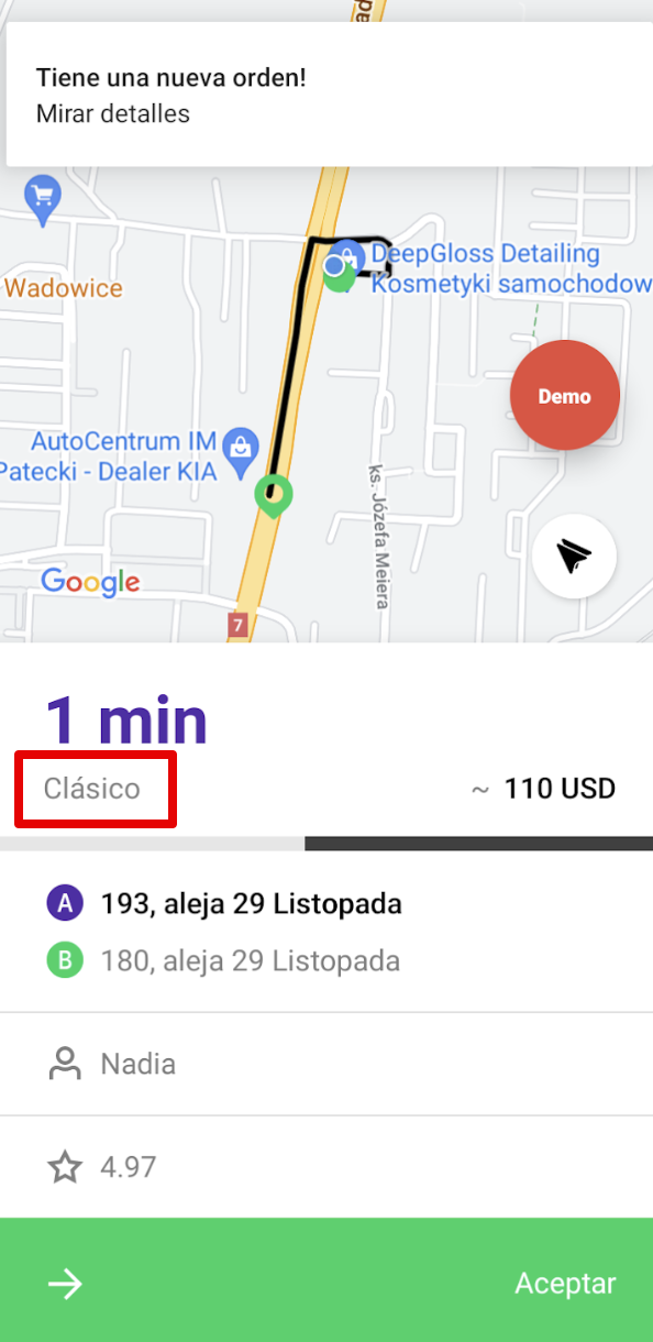 Sí, definitivamente. Una vez que el sistema ofrece una orden al conductor, en la parte superior de la pantalla se mostrará el nombre del servicio que el cliente solicitó. Entonces, si el conductor acepta la orden, también estará de acuerdo con sus tarifas.