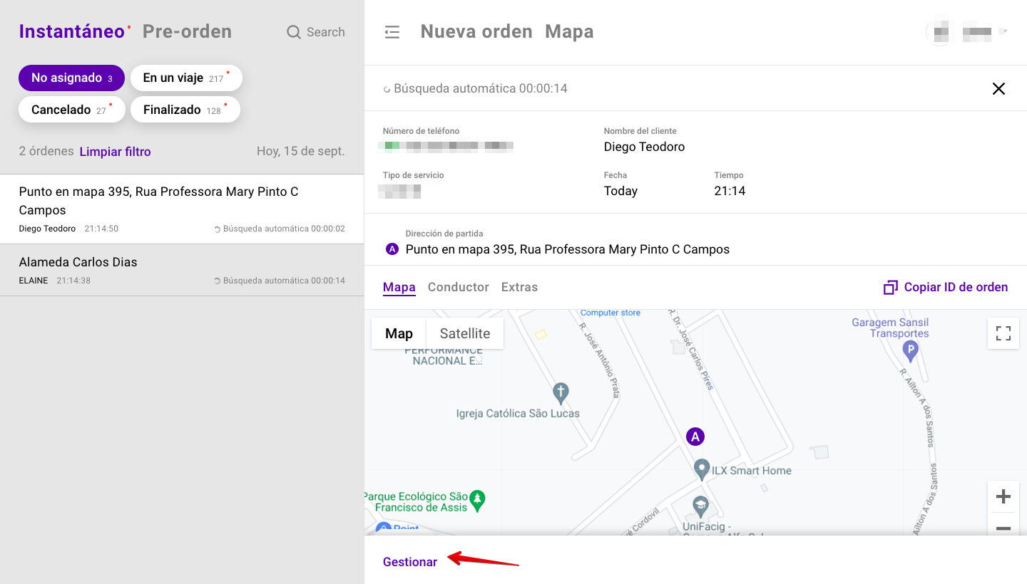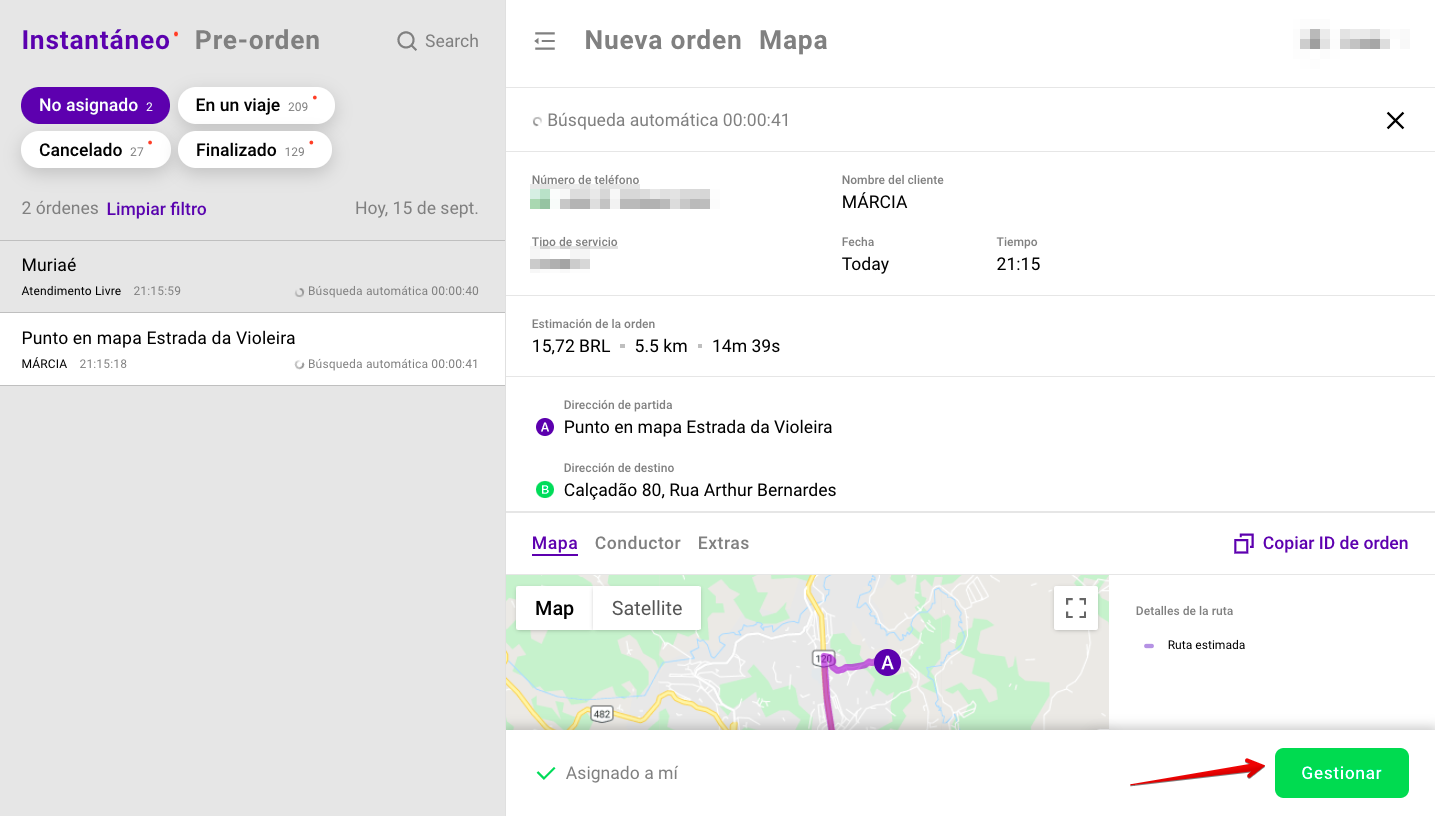 Para todos las órdenes generadas a través del app de operador, de la aplicación de clientes y del escritorio web, el operador está autorizado a reasignarla a otro operador seleccionando la opción “Asignarme” y cambiar manualmente el conductor. La orden se puede reasignar hasta que el conductor deslice en "Iniciar un viaje".