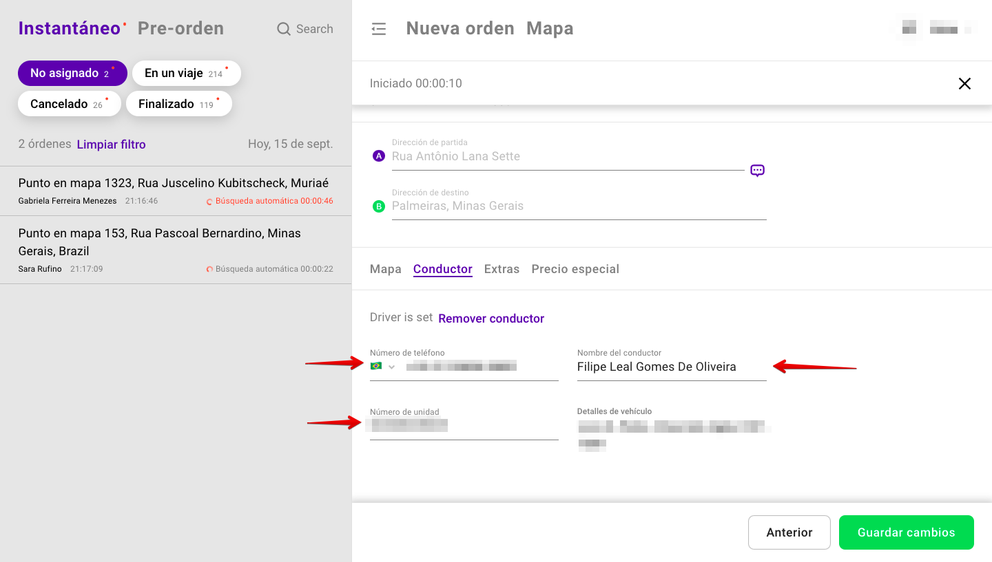 3. Abre la sección "Conductor" y cambie el número de serie del tablero (número de teléfono o nombre del conductor) por los detalles del nuevo conductor: