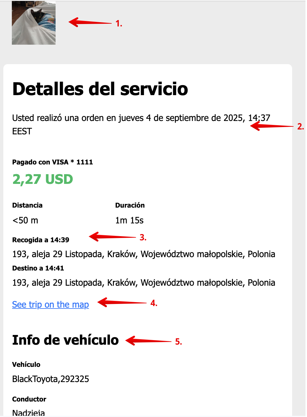 Pago: desglose de costos, total del viaje y método de pago;
