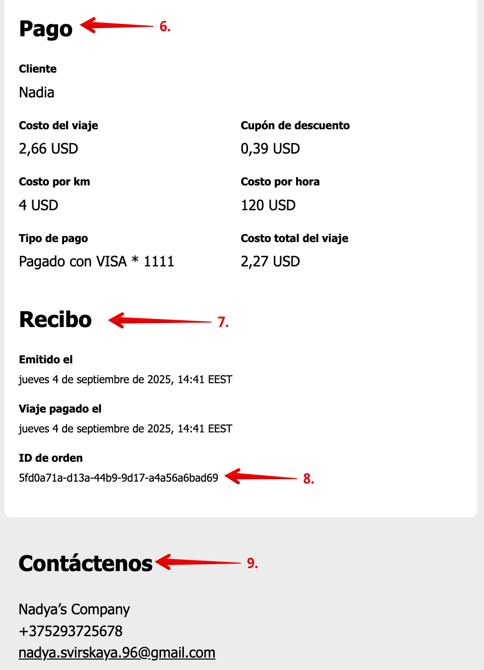 Al final de cada orden, la empresa, el cliente y el conductor reciben un resumen del viaje con información detallada sobre la misma. El conductor y el cliente lo reciben con la condición de que el correo electrónico se especifique en su perfil. Los resúmenes de viaje se envían solo para órdenes terminadas y canceladas por los clientes.