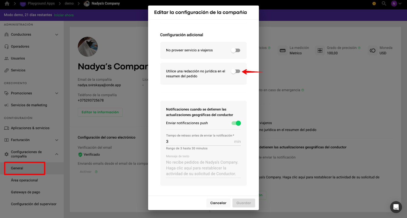 En algunos países, existe el requisito de que los recibos de viaje no contengan ninguna referencia a ningún término legal. Esto se puede lograr habilitando la casilla de verificación "Usar redacción no legal en el resumen del pedido" en Configuración de la empresa > General.