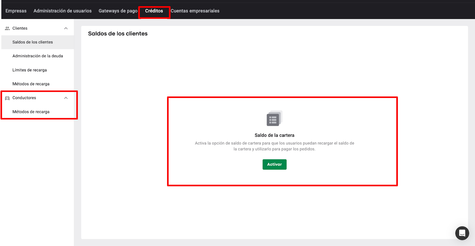 Incluso si la empresa no ha activado la Cartera del Cliente, aún puede administrar los métodos de recarga de la Cartera del Conductor en la sección "Cartera" de su comerciante