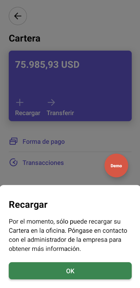 En caso de que todos los métodos de recarga estén deshabilitados para la recarga de la Cartera del Conductor, el conductor de la empresa verá una tarjeta Cartera. Sin embargo, al intentar recargar, se mostrará la siguiente notificación "Por el momento solo puede recargar su cartera en la oficina. Por favor, póngase en contacto con el administrador de la empresa para obtener más información"