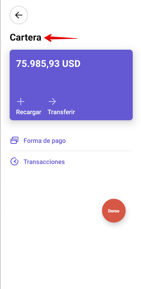 En caso de que todos los métodos de recarga estén deshabilitados para la recarga de Cartera del Cliente, el cliente de la empresa no verá ninguna tarjeta en la Cartera para la opción de recargar.