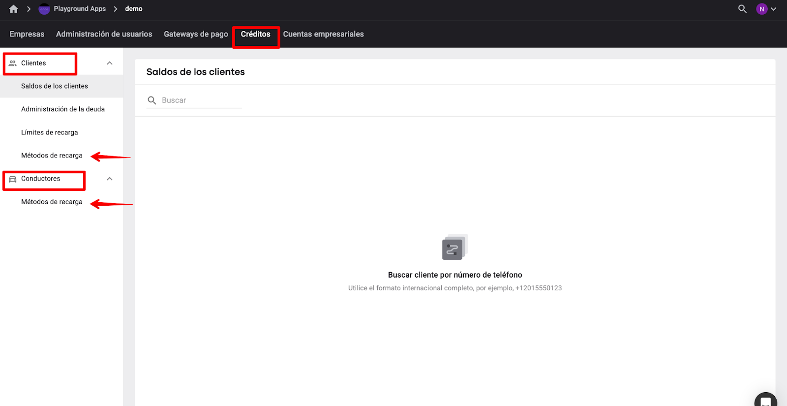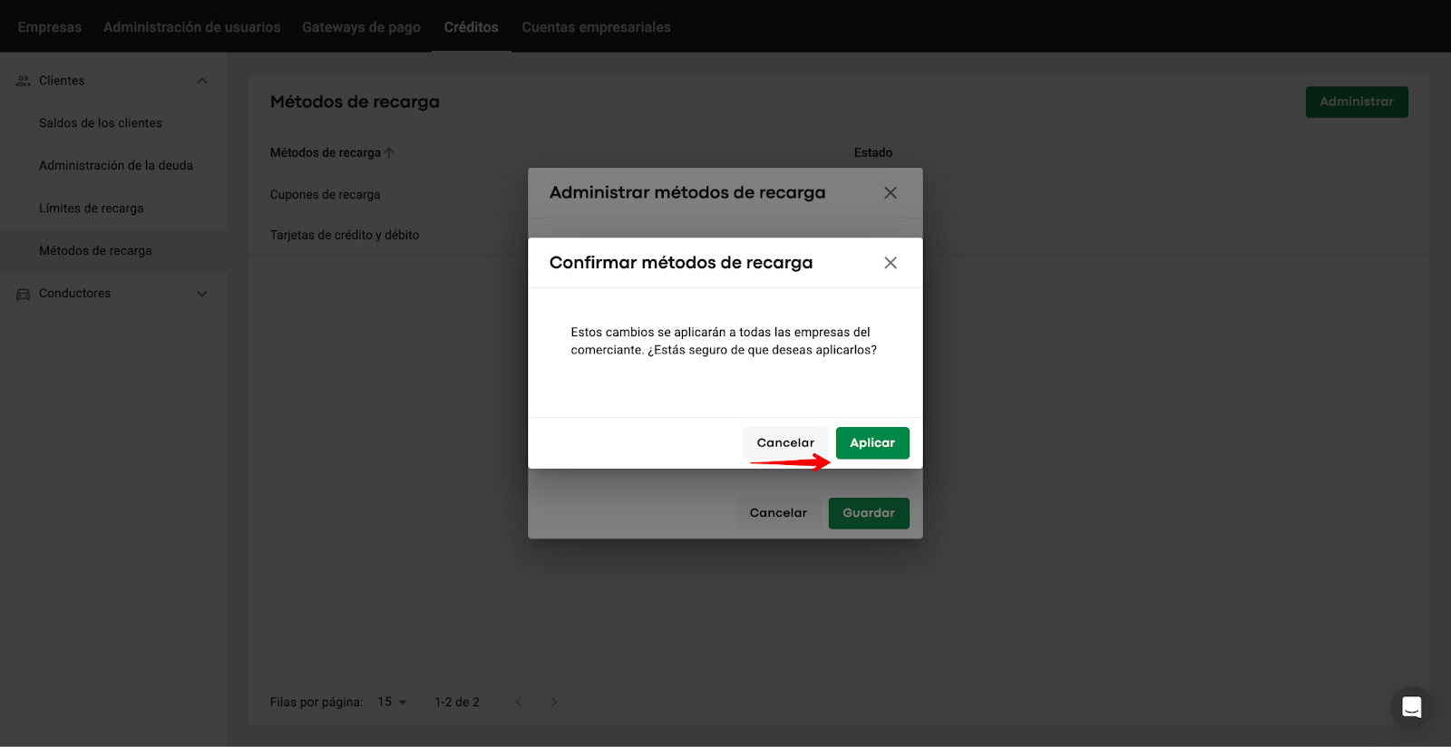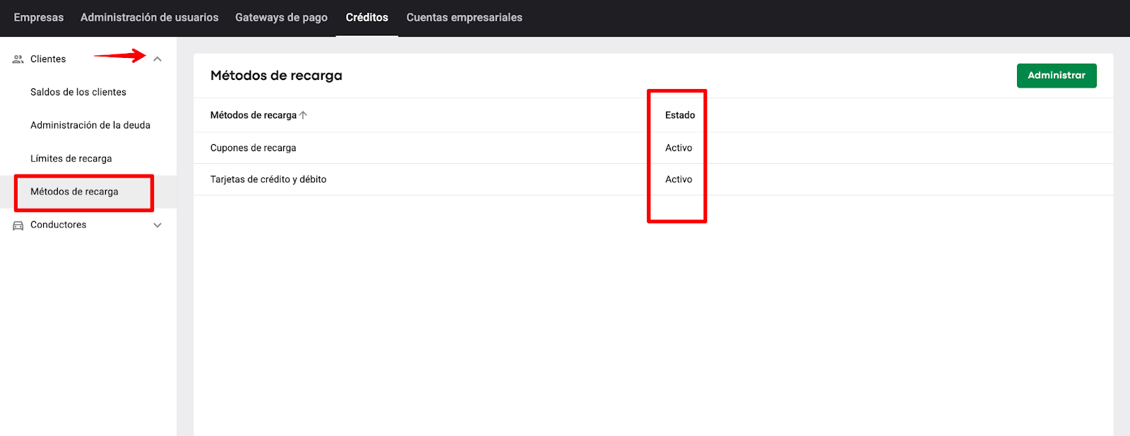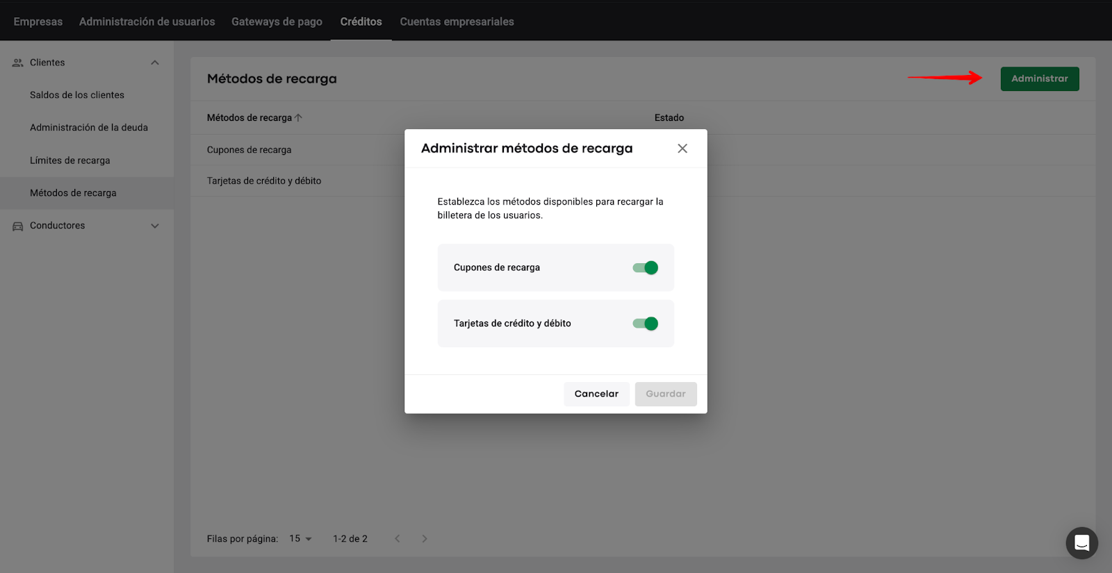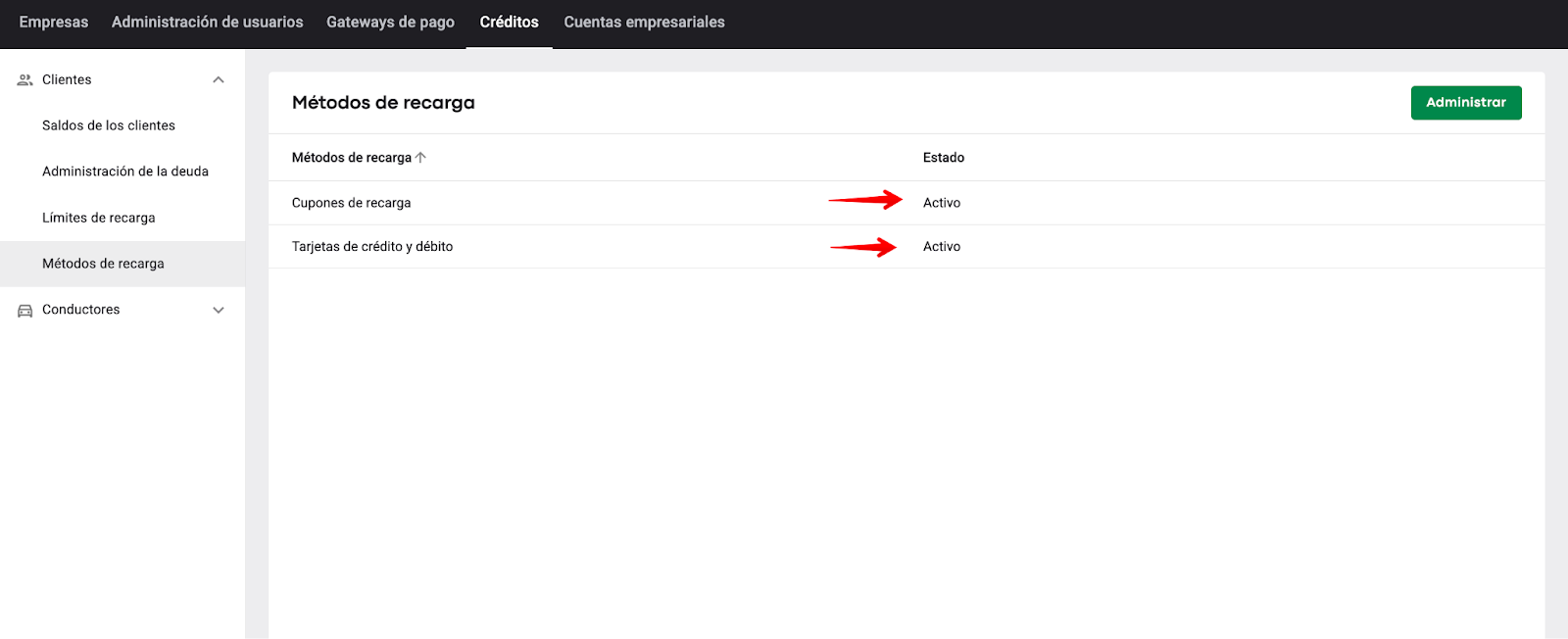Un manager de Marca/Empresa debe acceder a Empresa > Cartera > encontrar la opción "Métodos de recarga" en la lista desplegable para las Carteras de clientes y conductores y administrar los métodos por separado para clientes y conductores. Esto significa que un manager de Marca/Empresa puede: