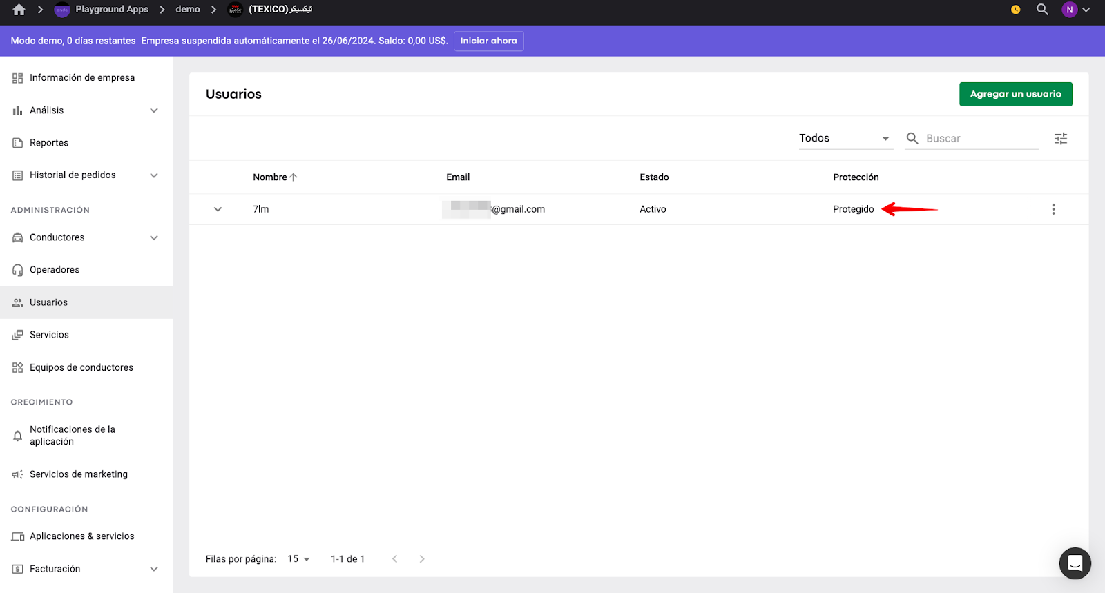 El acceso completo a una Empresa se otorga al usuario que inicialmente registró el demo. Este usuario está "Protegido" - no se puede eliminar.