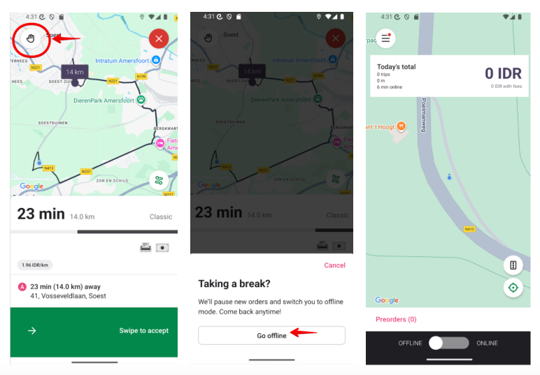 Una vez que el conductor toca la casilla "Desconectarse", su perfil de aplicación cambiará al modo fuera de línea y todas las ofertas de trabajo entrantes se rechazarán automáticamente.