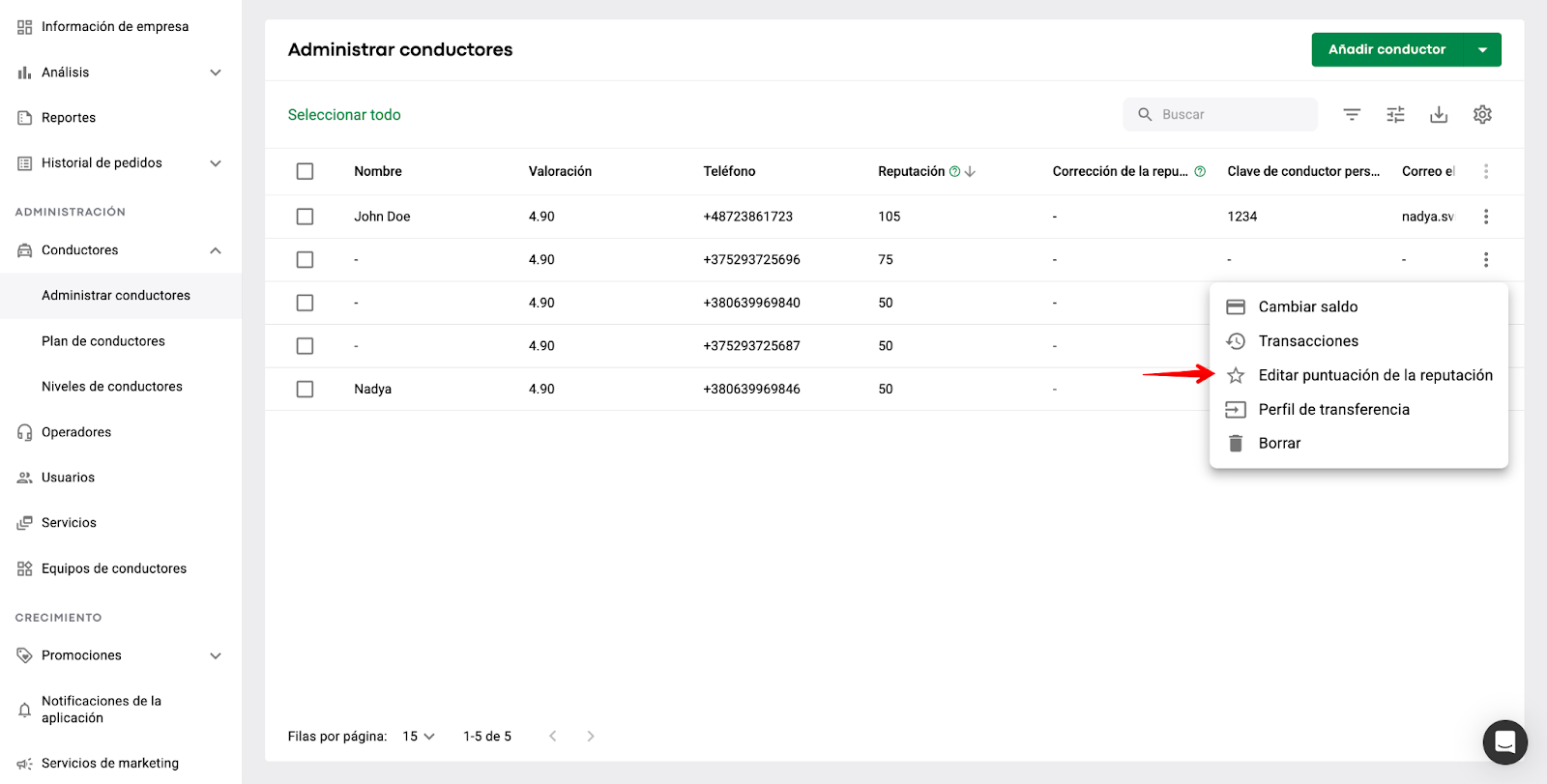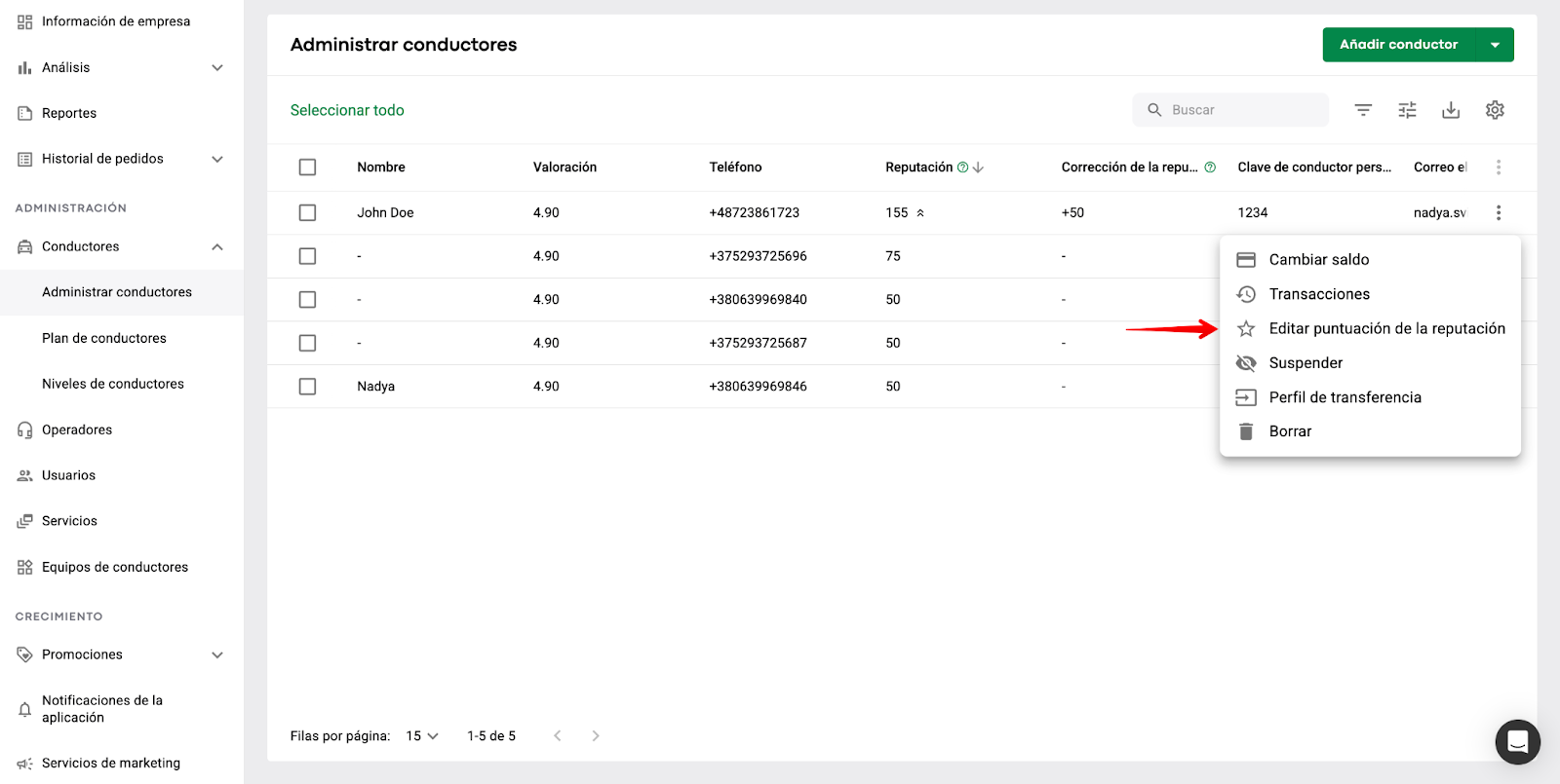 El manager de la empresa puede realizar un seguimiento de la puntuación de reputación de cada conductor de la flota en Administración de conductores > columna "Reputación".