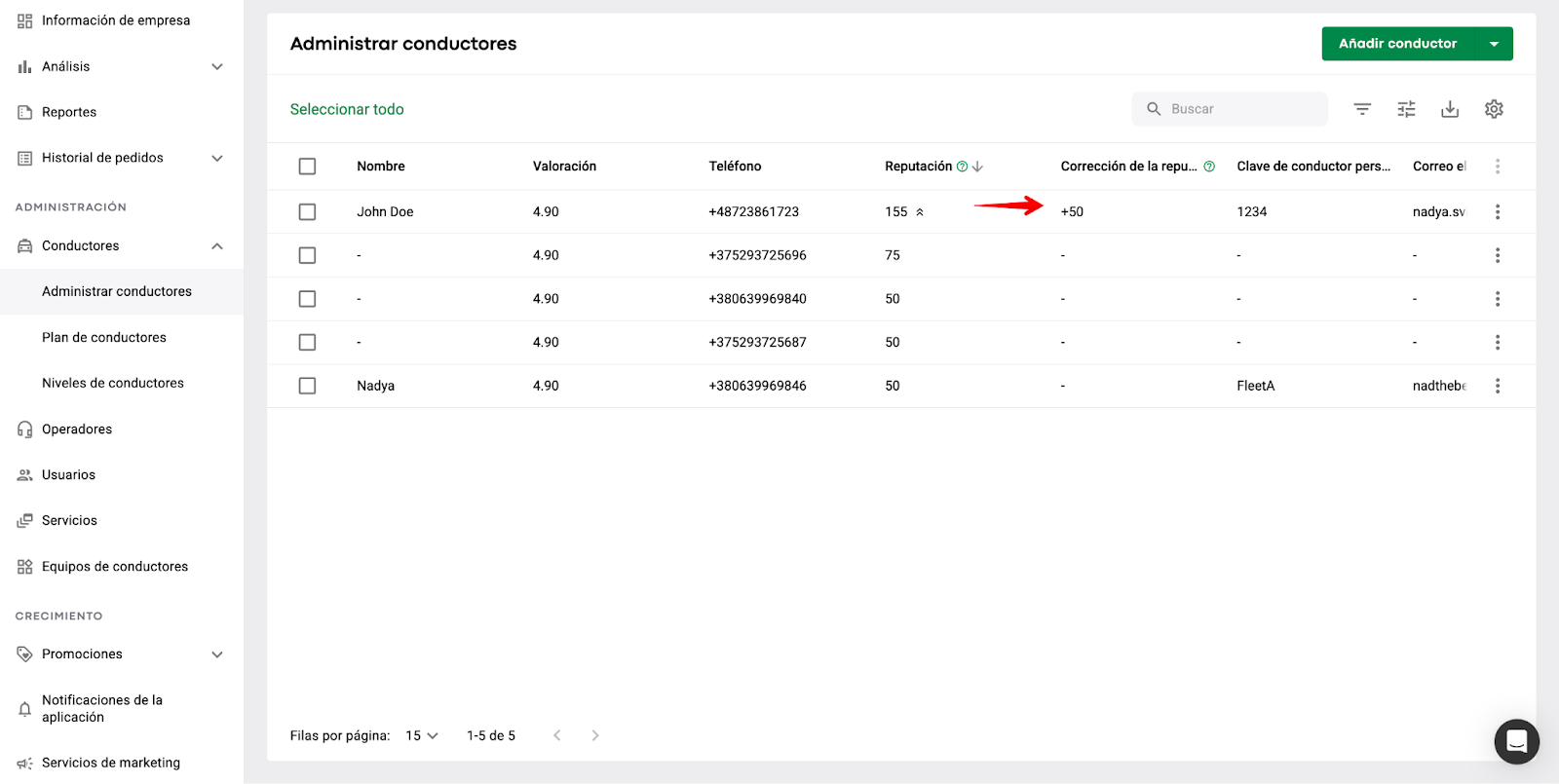 Los valores de corrección de reputación activos aplicados a todos los perfiles de conductores se pueden rastrear en la columna "Corrección de reputación" del perfil del conductor en Administración de conductores. Si no se ha agregado ninguna corrección, la columna mostrará un "-".