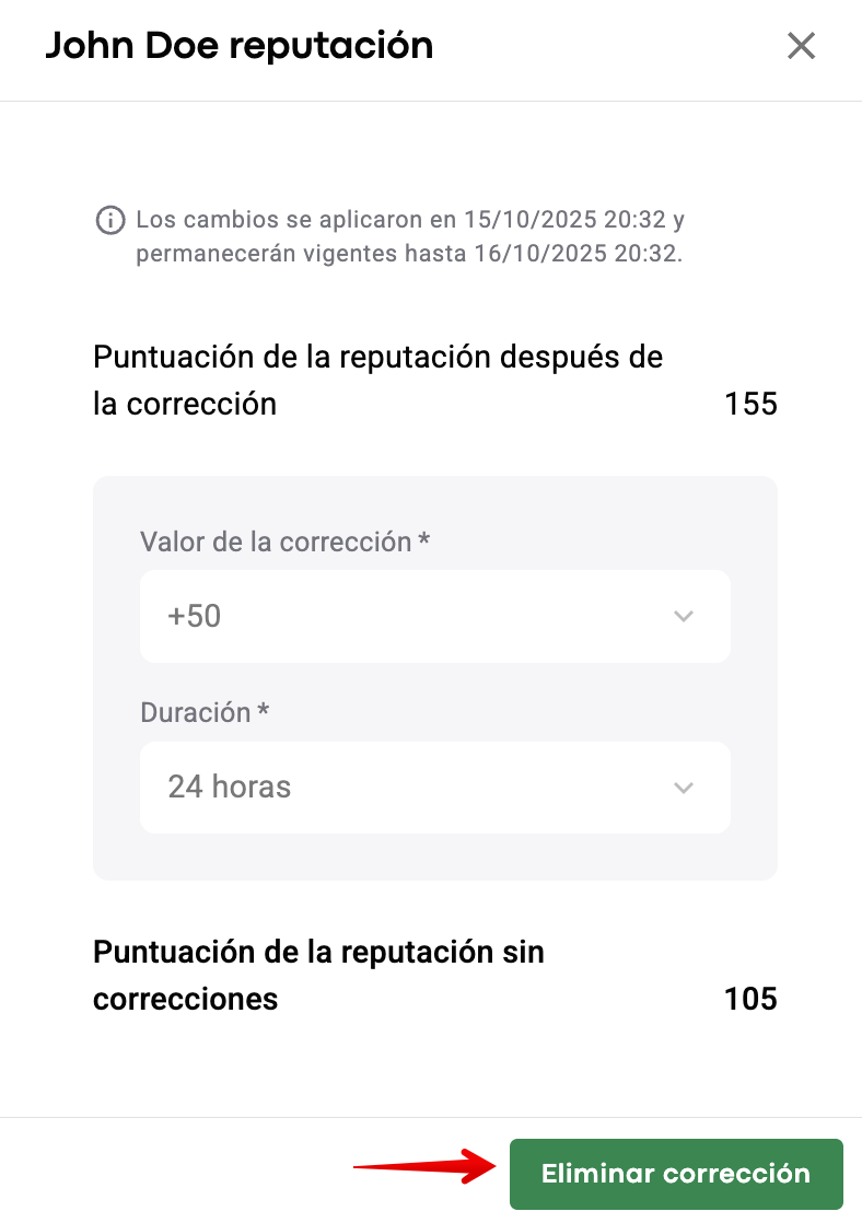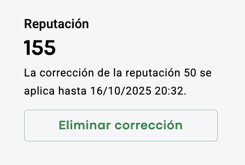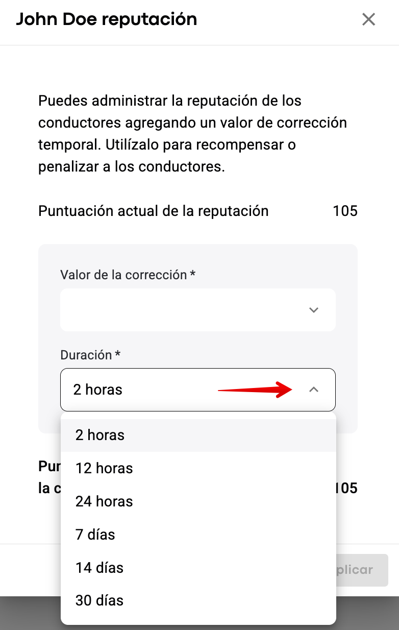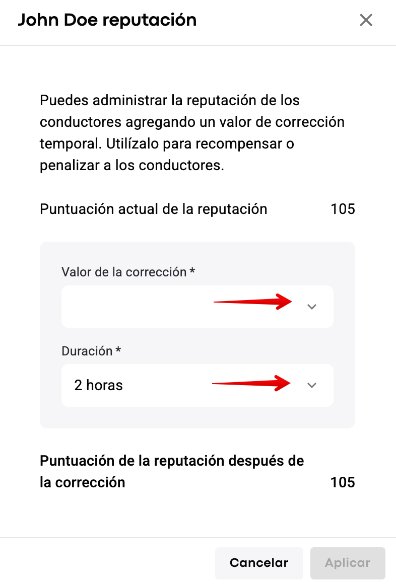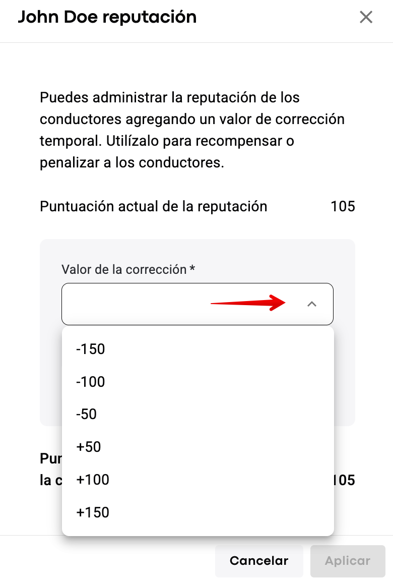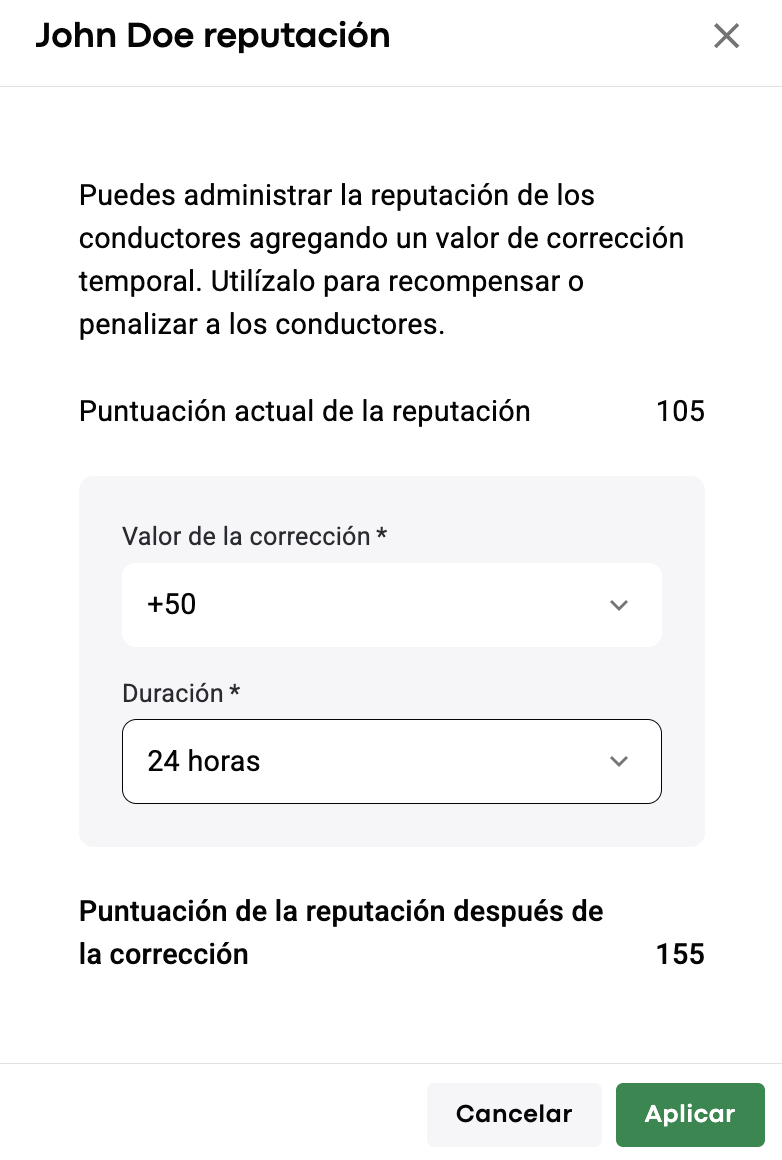 Con la corrección de reputación, la puntuación de reputación puede superar el rango predeterminado de -150 a 150. Por ejemplo, si la puntuación de reputación de un conductor es +150 y un gerente agrega +150, la puntuación de reputación temporal del conductor será +300.