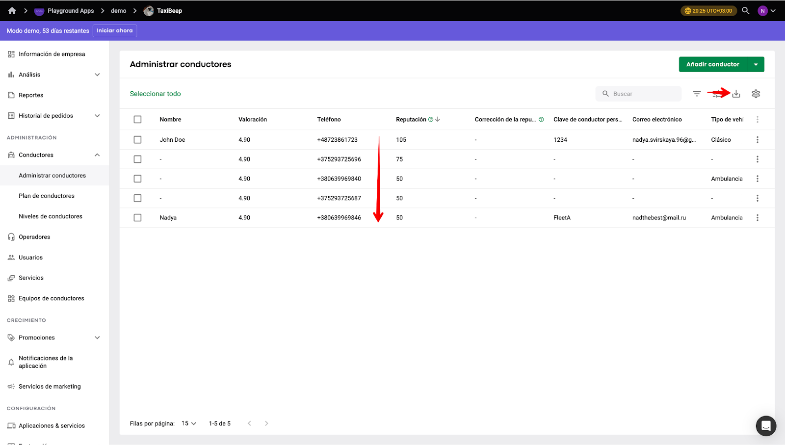 El manager puede ordenar a los conductores por su "Puntaje de reputación" para rastrear los perfiles con los puntajes más altos y bajos y exportar sus datos a CSV.