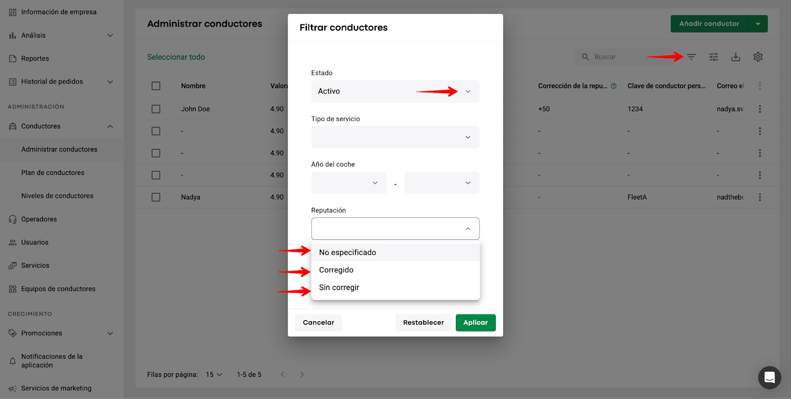 También puede filtrar los conductores por cualquier estado (Activo, Suspendido, etc.), así como una de las opciones de reputación:
