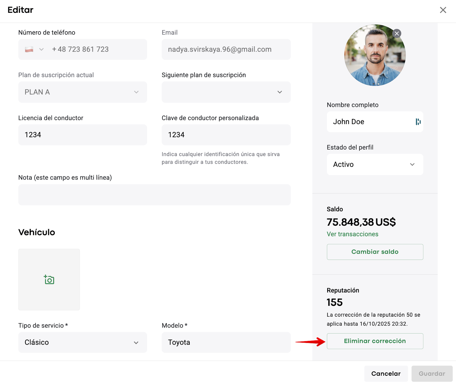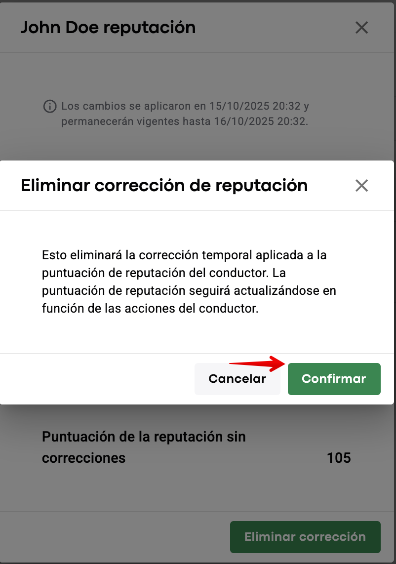 1. Para eliminar la corrección de reputación de un conductor: