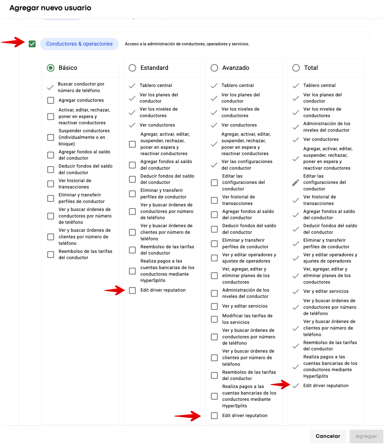 - Estándar/Avanzado (si la casilla de verificación "Editar reputación del conductor" está habilitada en los permisos de usuario)