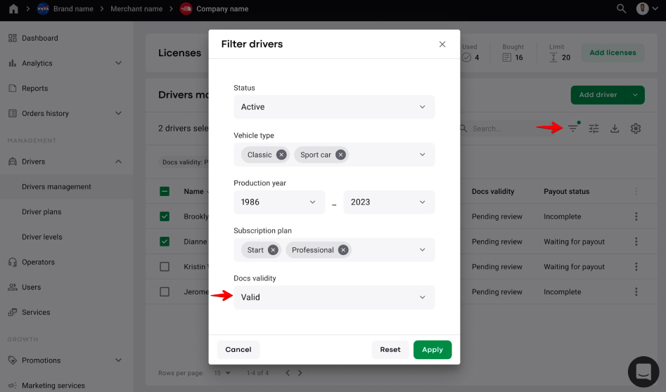 One can easily filter drivers by “Pending review” status in the Documents validity parameter and check all the profiles for which documents require review.
