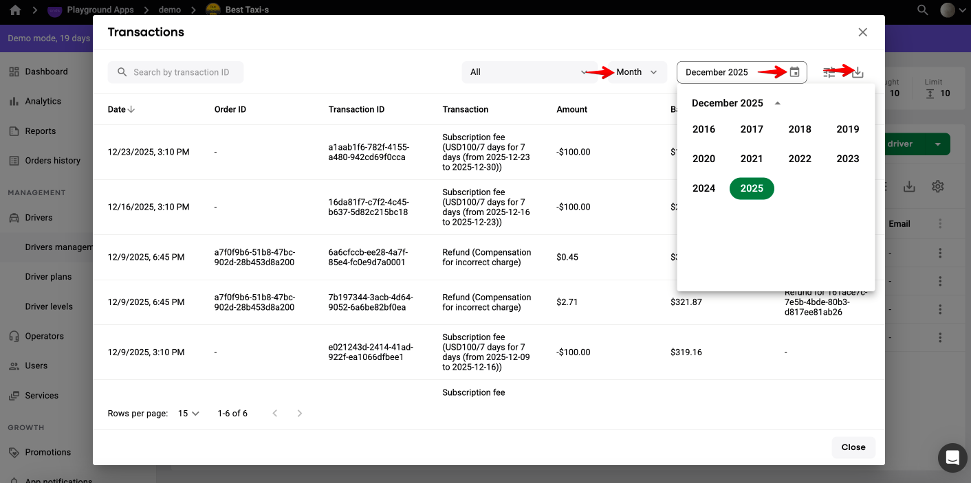 A company manager can filter a driver’s transaction per type, select the day/month the transactions are needed for and export them to CSV.