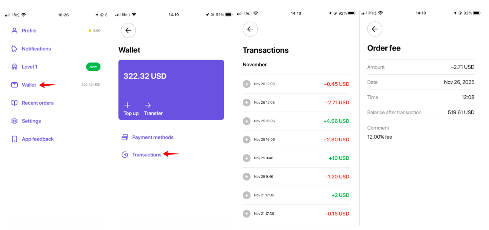 To check Wallet transactions in the driver app, a driver should access the side menu of the app profile > Wallet > Transactions. The transactions are displayed chronologically. Tap on a transaction to check its details.