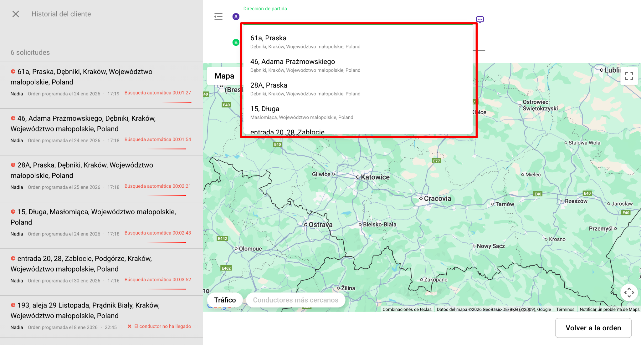 Para agilizar la creación de pedidos en la aplicación del Operador, cada registro de "Nuevo pedido" de un cliente obtiene un máximo de 5 direcciones recientes de recogida y destino utilizadas por el cliente en los pedidos recientes.