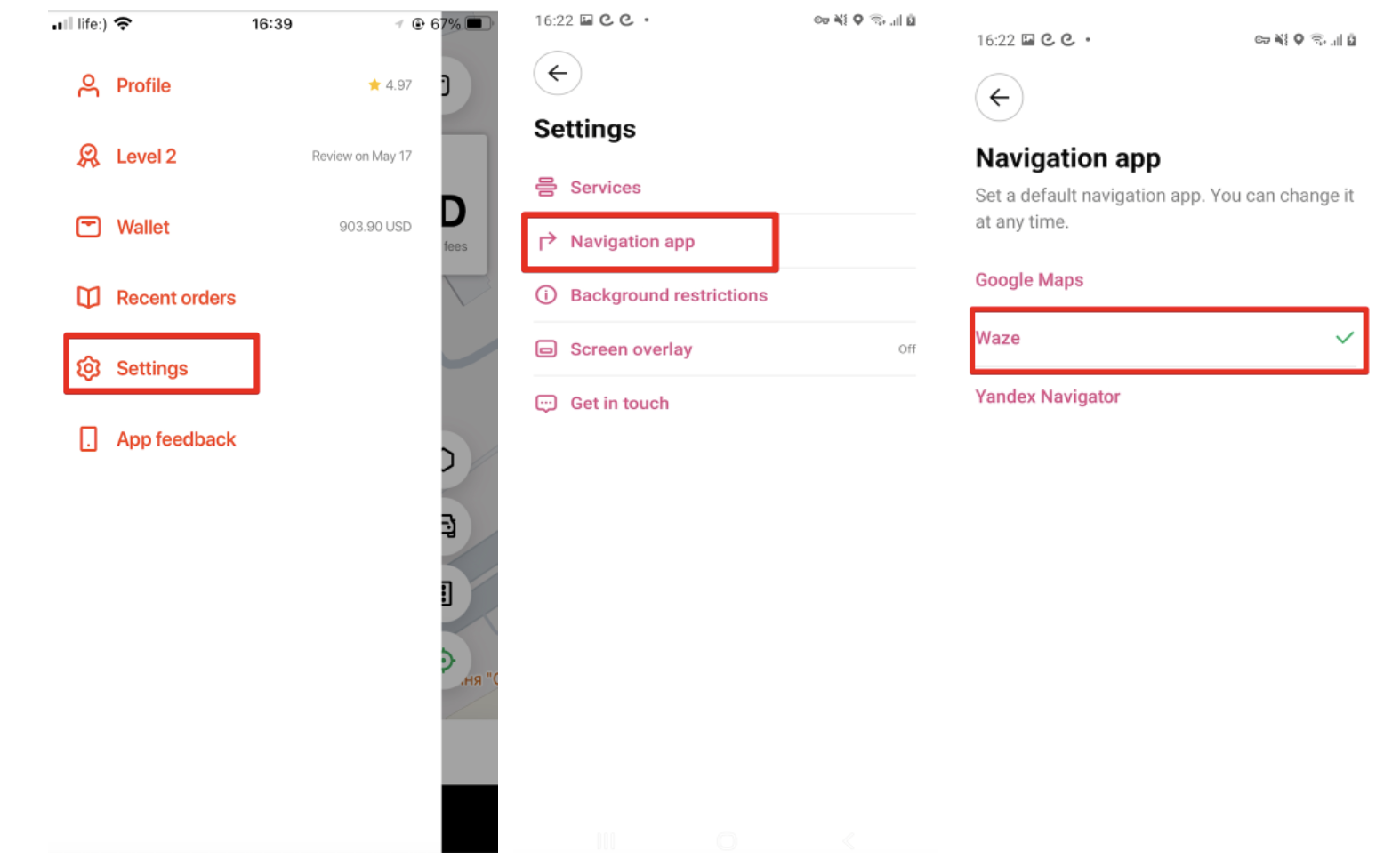 Default Navigator choice is stored in the Side menu of one’s driver app profile: Settings > Navigation app. Default navigator can be updated at any time from Settings.