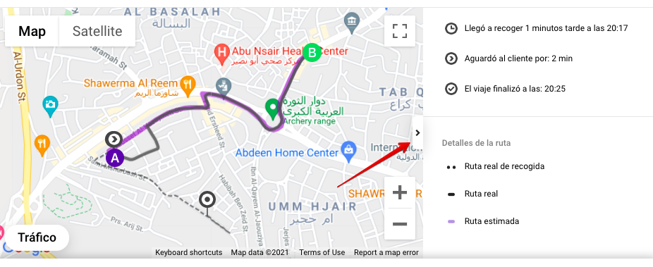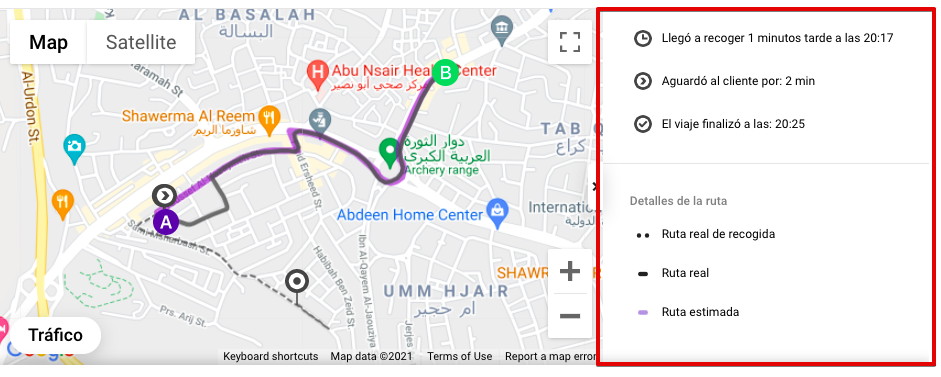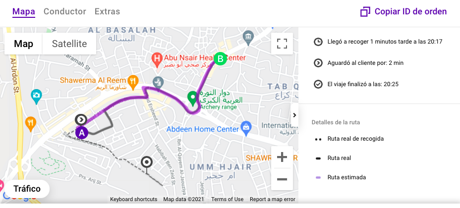 Ruta real para recoger al cliente - una línea de puntos en el mapa que muestra la ruta que un conductor tomó desde su ubicación original para recoger al cliente (A)