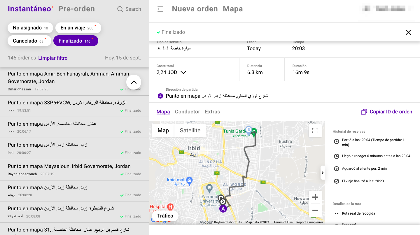 El panel de operador es una gran herramienta en línea para monitorear los viajes actuales, rutas relacionadas y los conductores que han procesado las órdenes. Por otra parte, se pueden revisar todos los viajes anteriores que quedan registrados en el panel por 30 días. La búsqueda por ID de pedido ayuda a recuperar cualquier pedido procesado por la empresa (Nota: los pedidos con el estado "BÚSQUEDA EXPIRADA" solo pueden ser rastreados en los informes). Esto permite verificar los datos del viaje y resolver posibles problemas entre cliente/conductor.