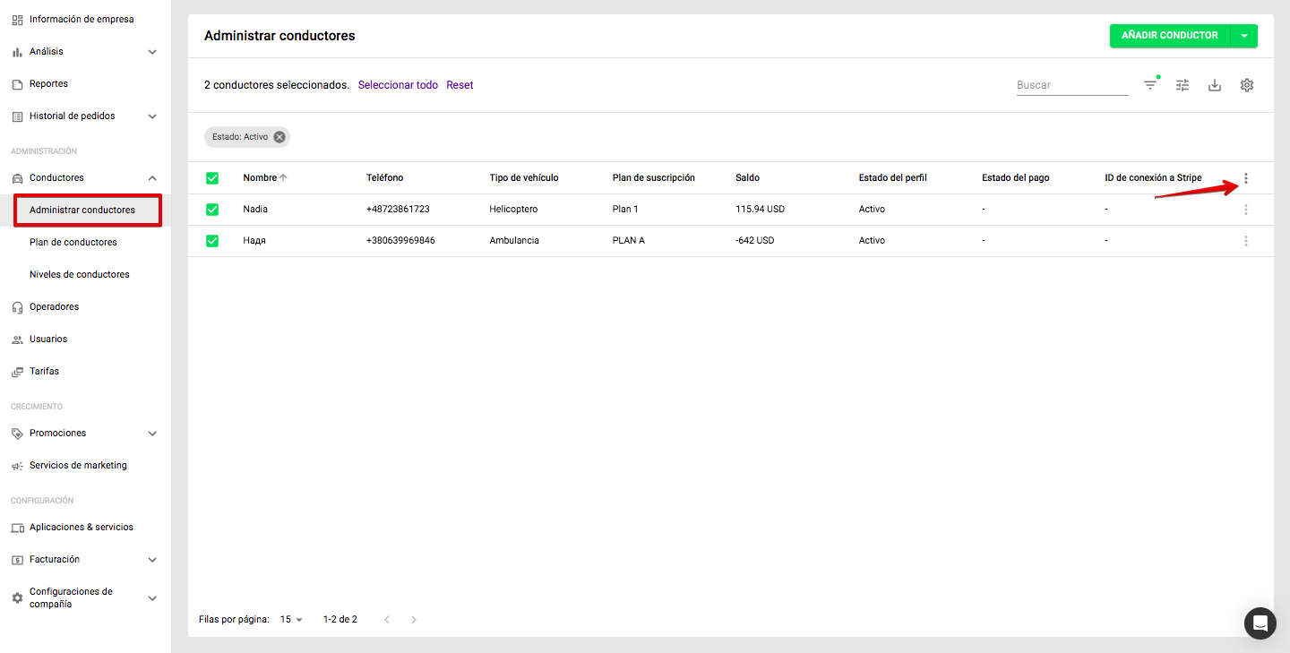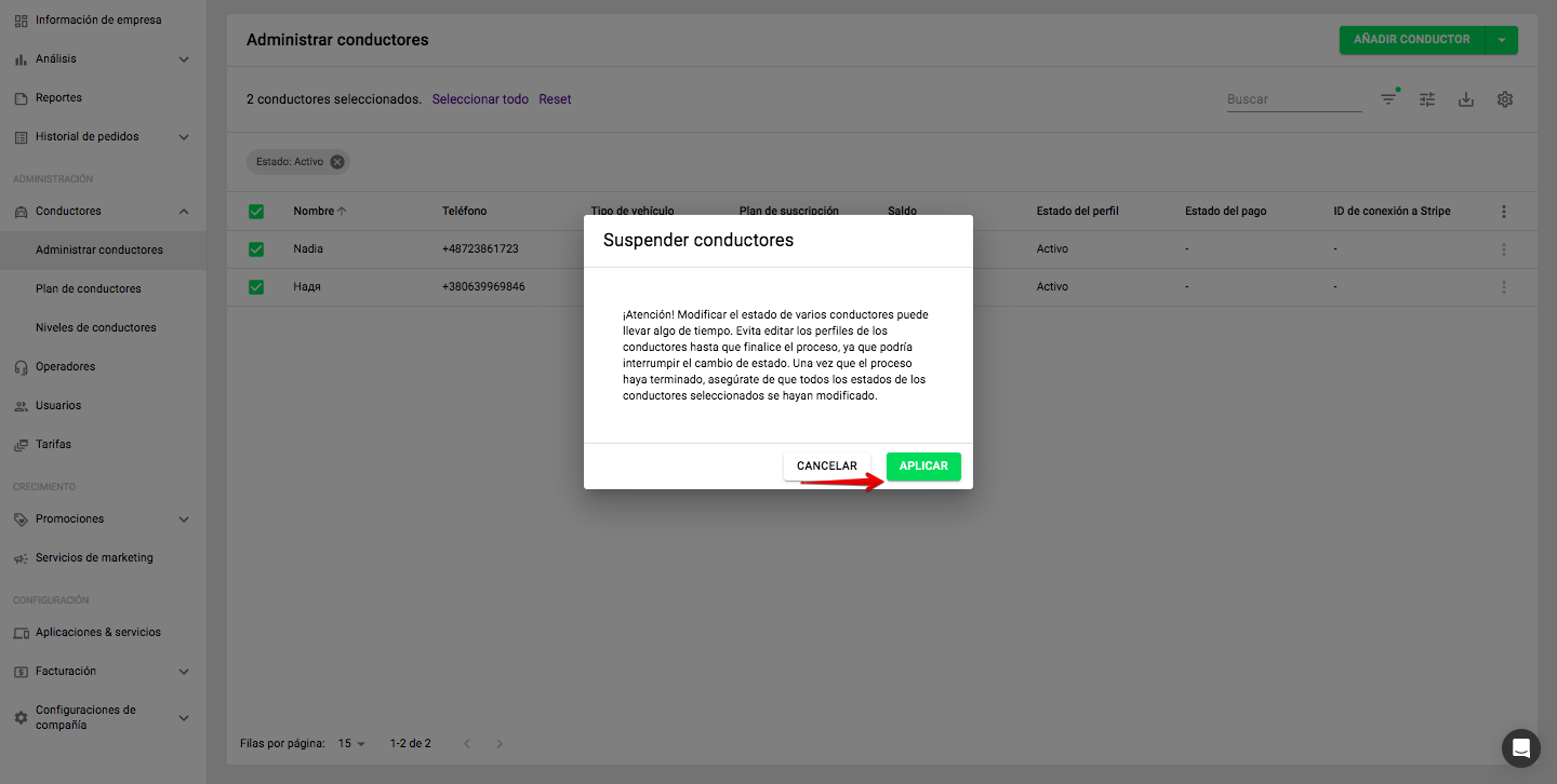 Para realizar una operación masiva con conductores activos, sigue los siguientes pasos: