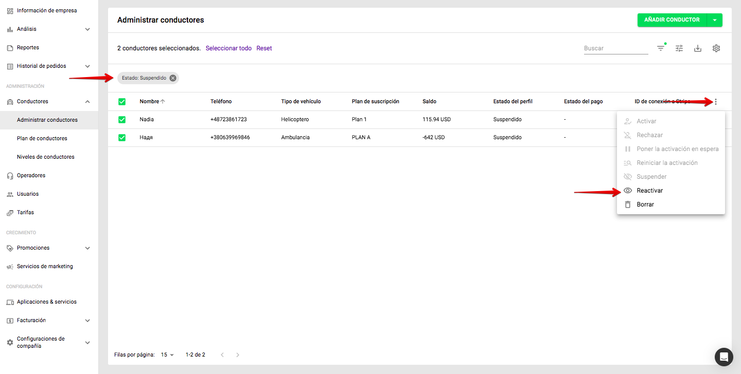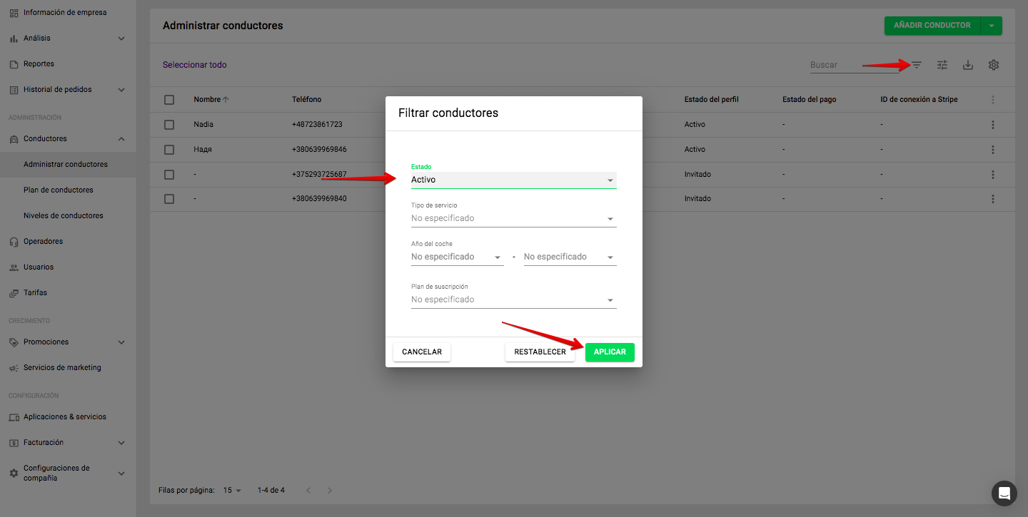 2. Haz clic en el icono de filtro y filtra los conductores con el estado "Activo".