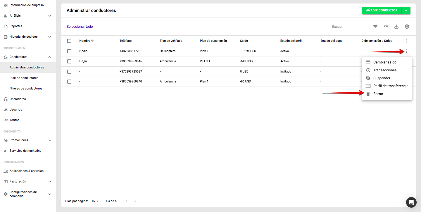La operación "Borrar" solo está disponible para cada conductor individualmente. No se pueden eliminar conductores en masa. Esto es por razones de seguridad, para prevenir una operación masiva errónea, la cual es irreversible.