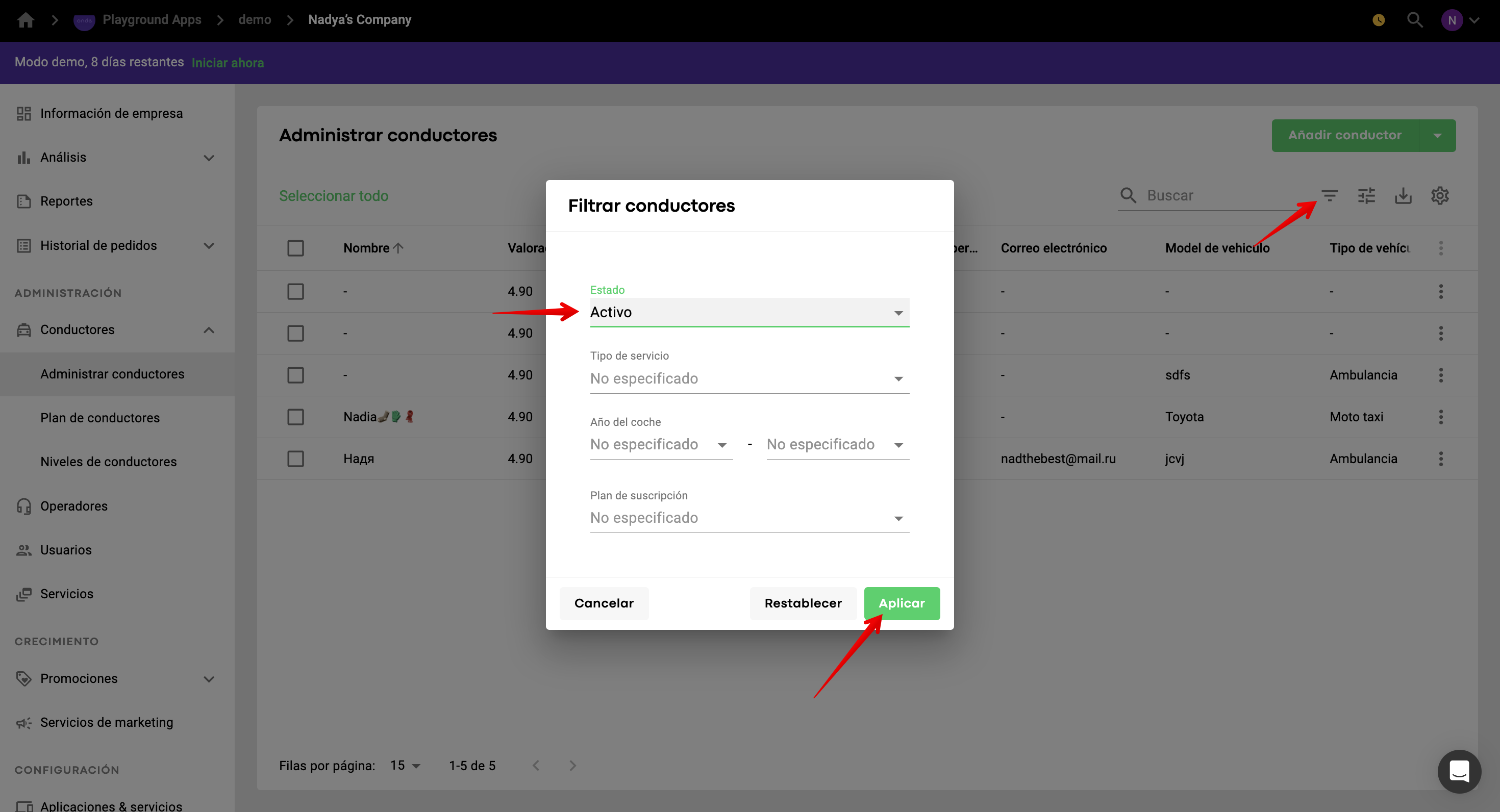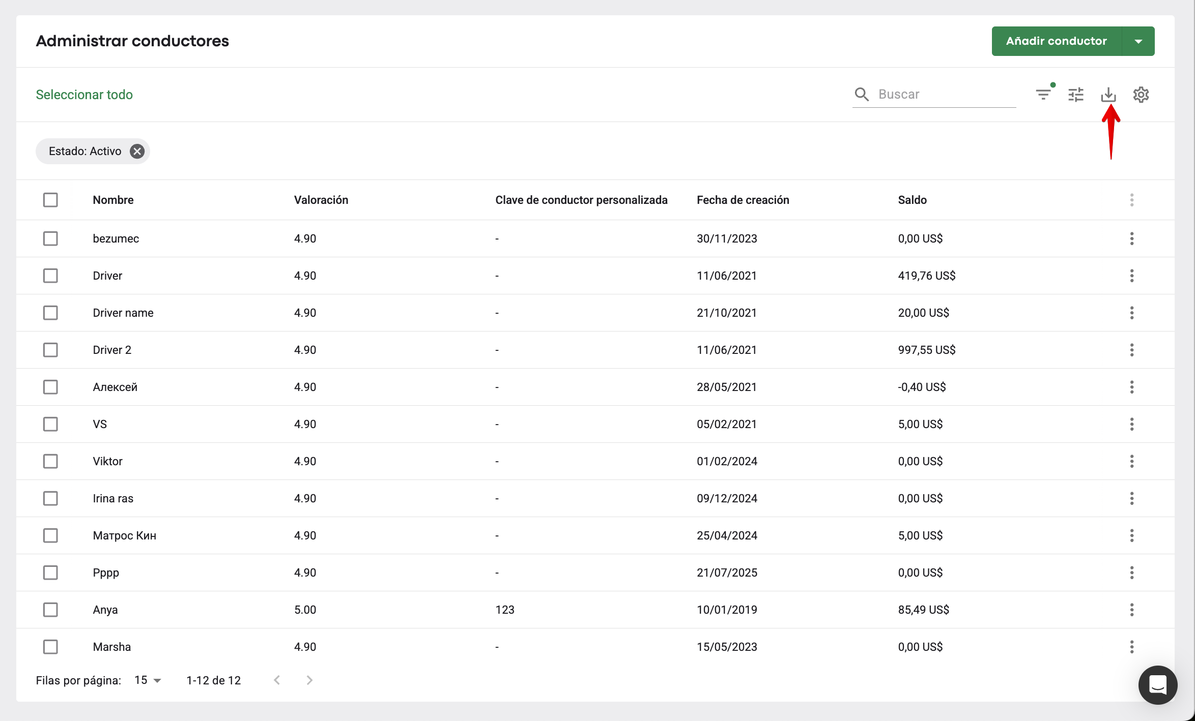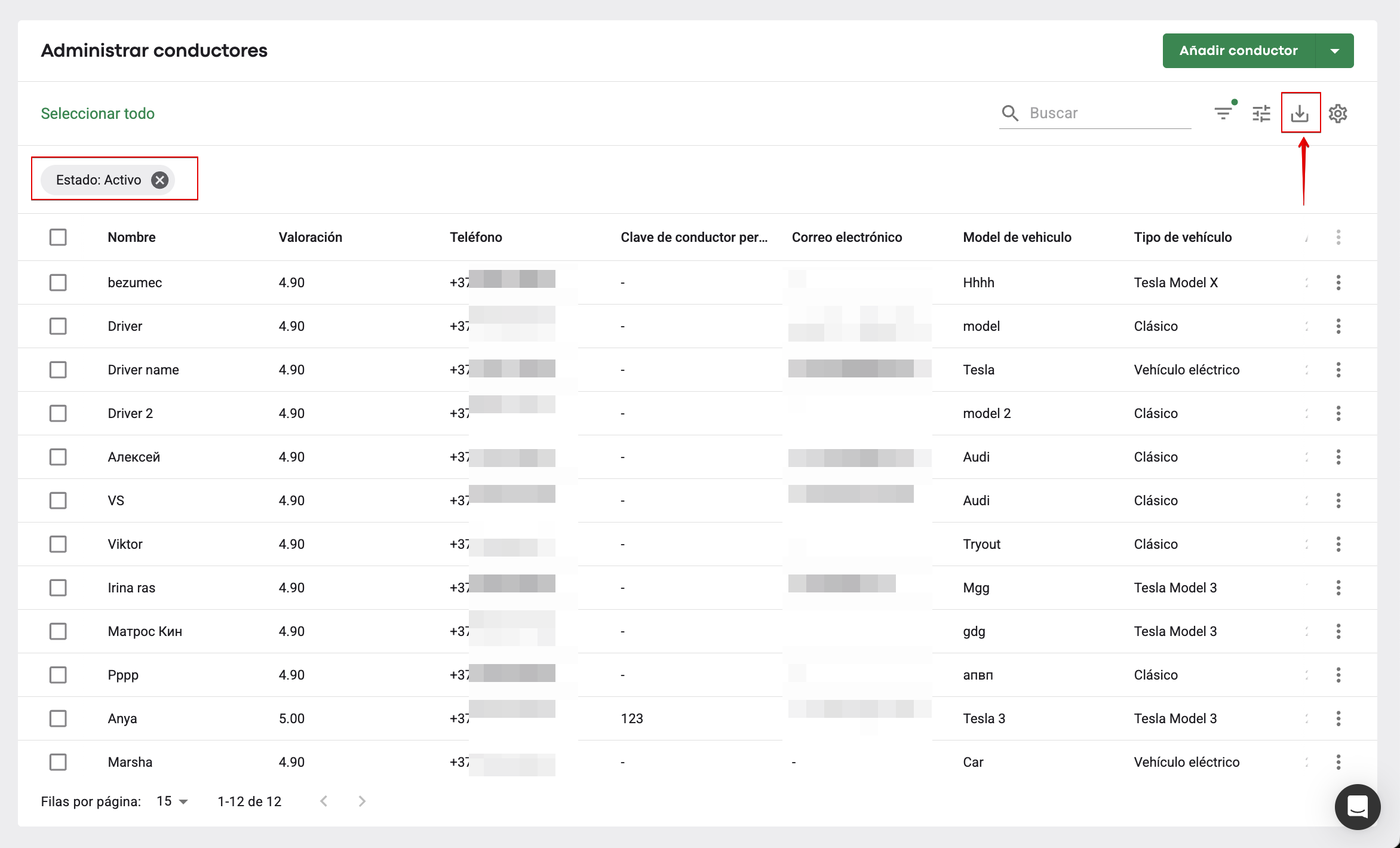 Por ejemplo, al descargar un informe con el estado "Activo", puedes exportar y manejar los datos solo de los conductores Activos.