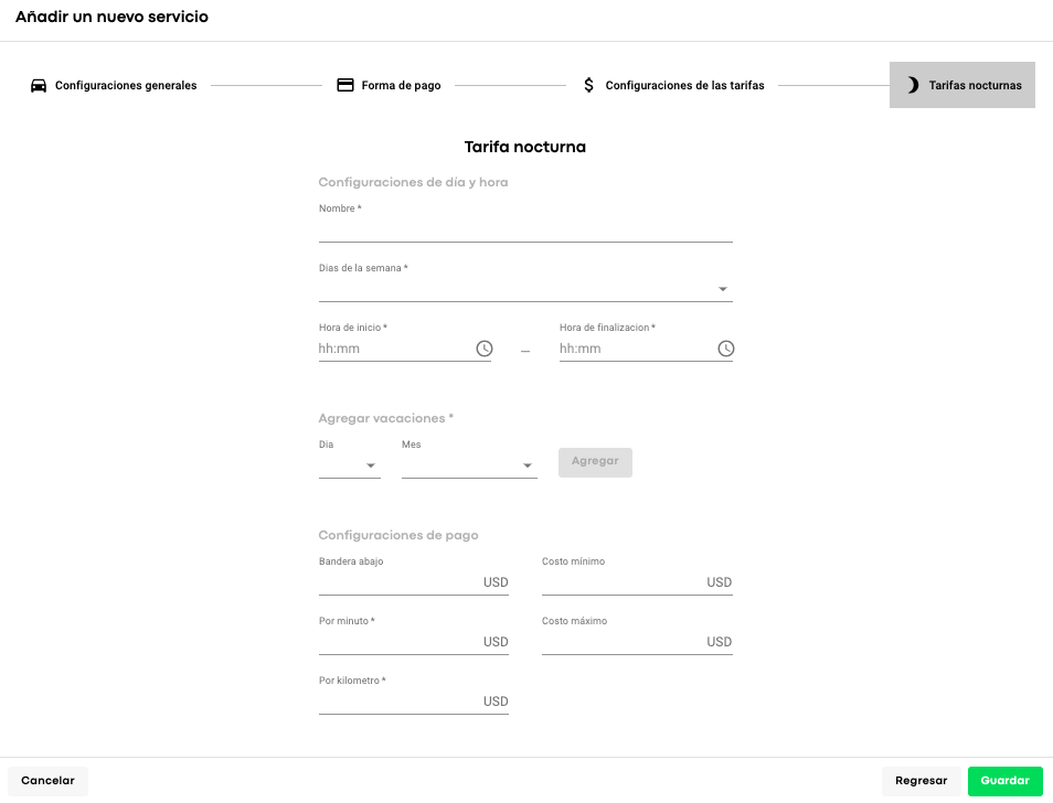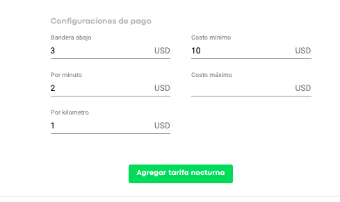Una vez hecho esto, completa las “Configuraciones de pago” que se aplicarán dentro de este período de tarifa: bajada de bandera, por minuto, por kilómetro y costo mínimo y presiona “Agregar tarifa nocturna”.
