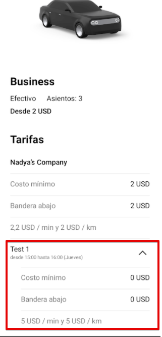 Ten en cuenta que en caso de que se establezcan zonas de tarifa fija para la empresa y se defina el punto de destino, las tarifas nocturnas no se aplicarán.