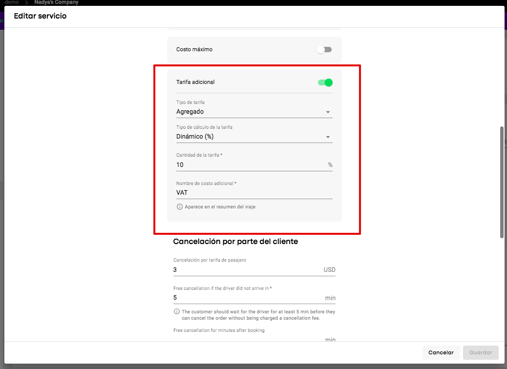 En caso de que el "Tipo de cargo adicional" se establezca como "En la parte superior" la tarifa se añade al costo del viaje.
