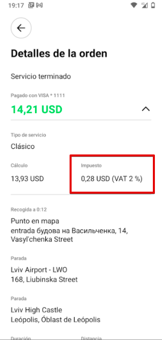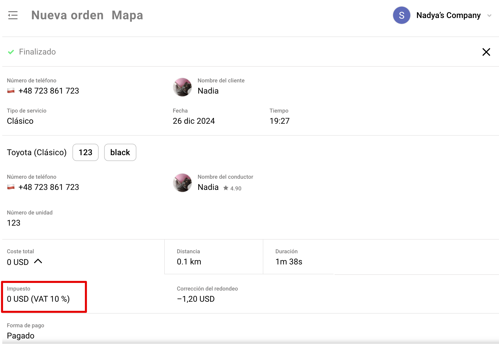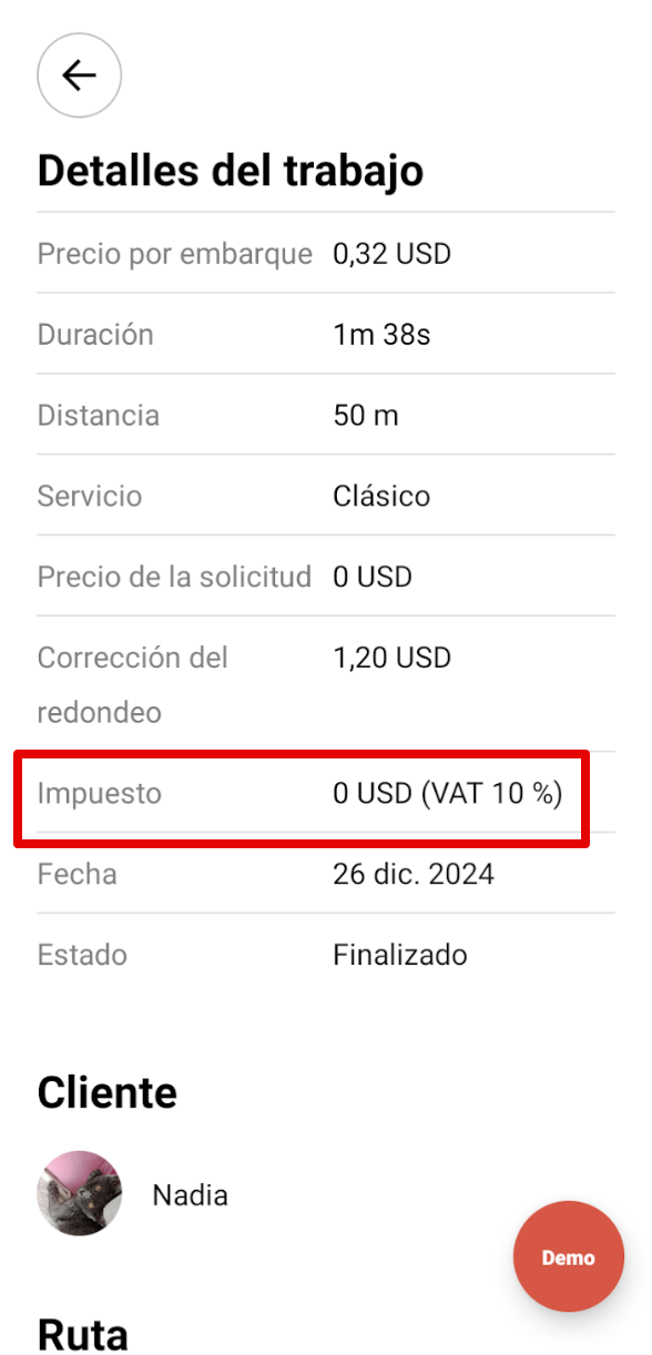 La notificación de tarifa se mostrará a los clientes/conductores/operadores antes del viaje y se registrará como una línea adicional en el historial de recibos de viaje/reservas para clientes, conductores, operadores y empresas. Por ejemplo: "Tarifa adicional del 10%, IVA añadido al costo del viaje"