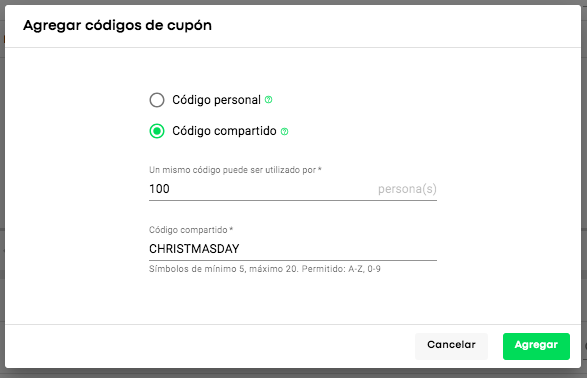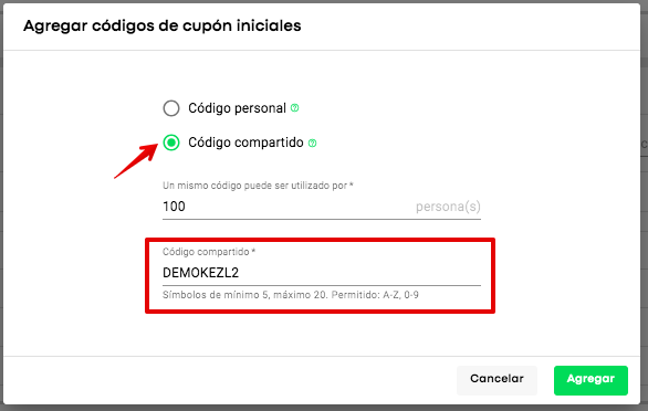 Puedes establecer un valor personalizado para los códigos del cupón de "código compartido" dentro de los programas de Referidos y de Cupones. El código compartido personalizado se puede definir para cada nueva serie de códigos de cupón agregados a una promoción basada en cupones: