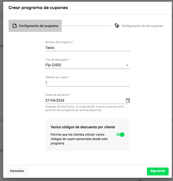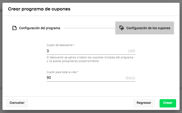 Presiona CREAR para finalizar la creación del programa. Se abrirá un diálogo para agregar la primera serie de códigos de cupón para el programa.