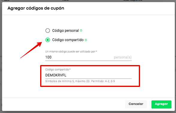 2. Especifica el número de cupones con este código que deseas crear (por ejemplo, 100)