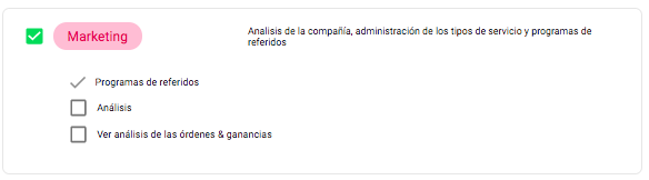4. El usuario de Marketing tiene acceso a análisis de la empresa, gestión de servicios y programas de referidos.