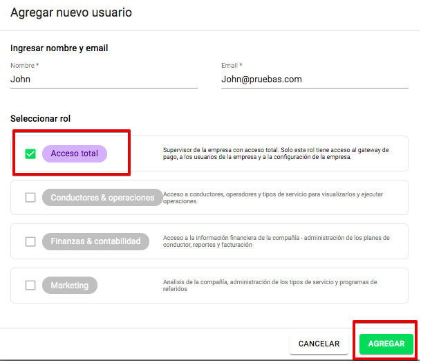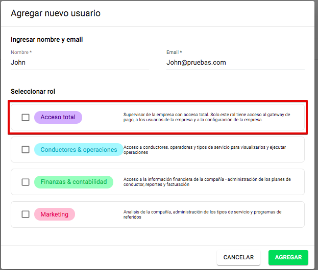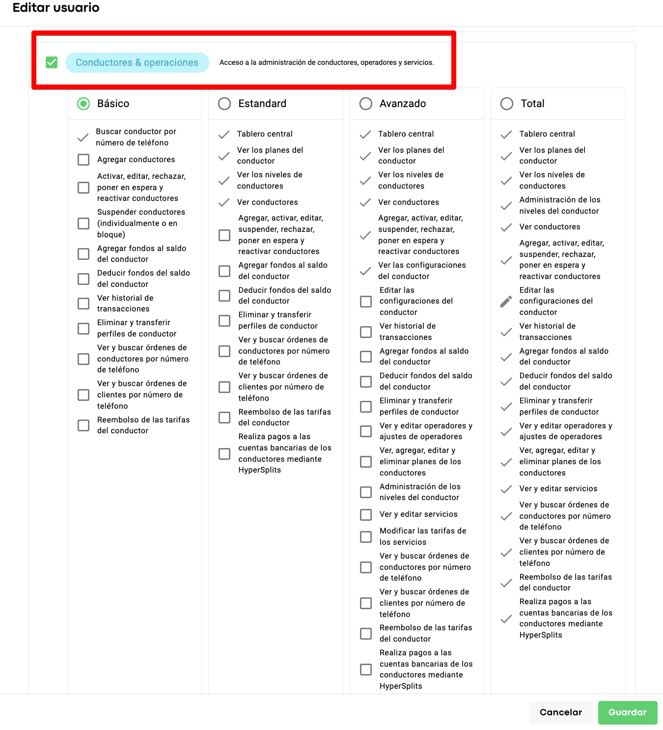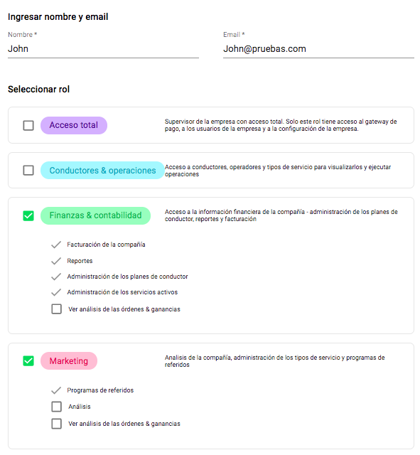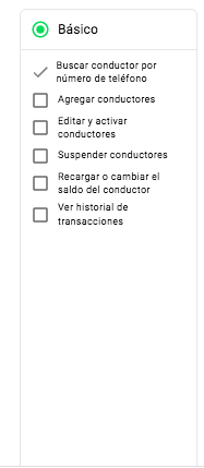 A un manager se le puede dar permiso solo para agregar conductores, a otro para cambiar el saldo, etc. Alternativamente, se puede otorgar una combinación de permisos opcionales para un alcance más amplio de responsabilidades.